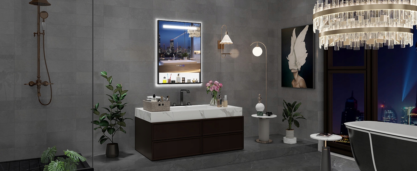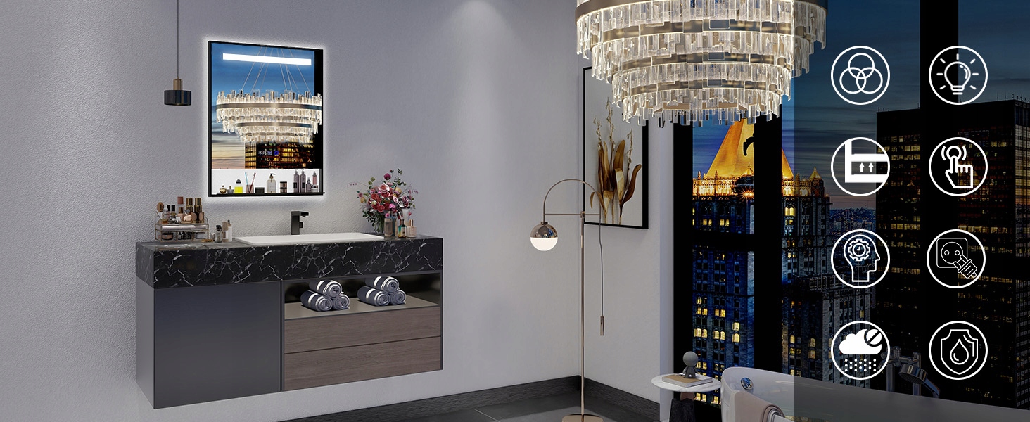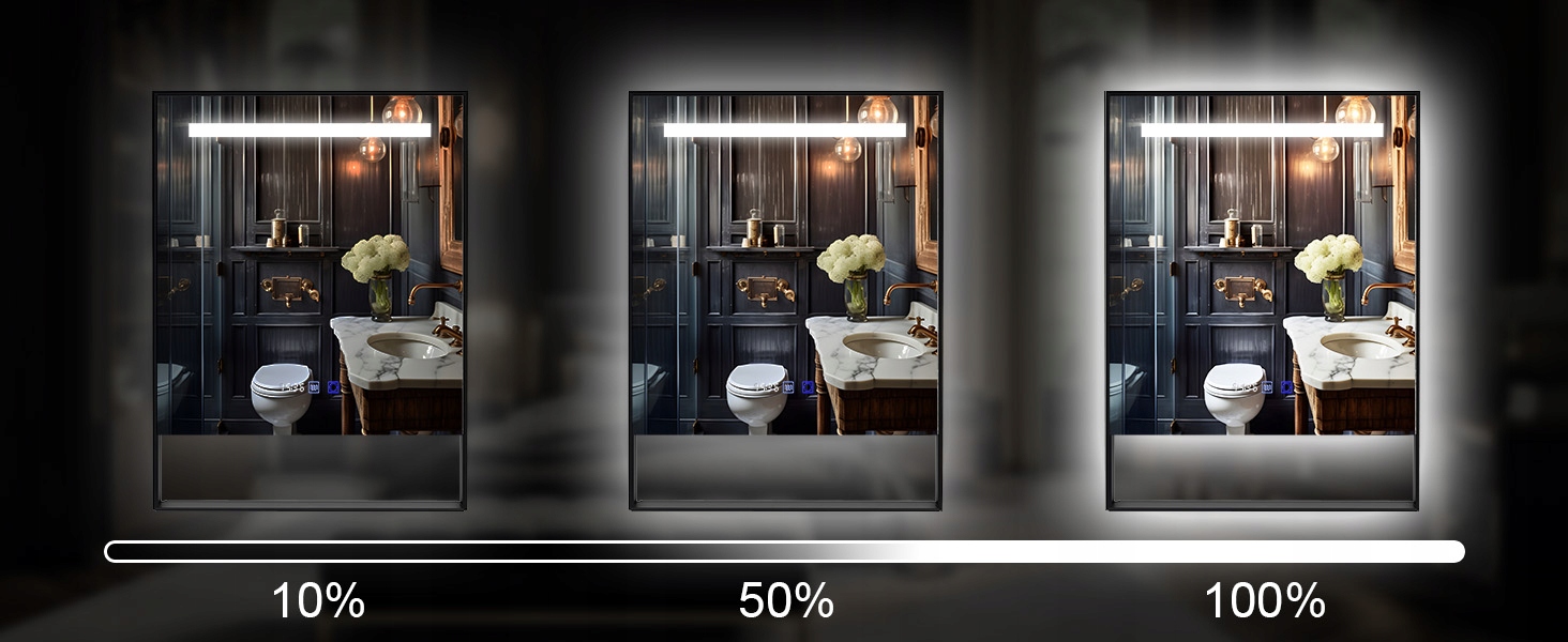 Długo naciśnij przycisk podświetlanego lustra łazienkowego, jasność można regulować w zakresie od 10% do 100%. Funkcja pamięci lustra łazienkowego LED może zapamiętać ostatnie ustawienie światła, ułatwiając obsługę.