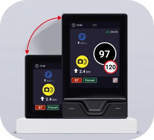 Obsługa nowego wyświetlacza w Yanosik RS to czysta przyjemność. Dotykaj, przesuwaj i obracaj. Ekran w Yanosik RS pracuje w dwóch trybach – poziomym i pionowym. Dostosuj układ do swoich potrzeb i zachowaj wysoki komfort użytkowania w trasie.