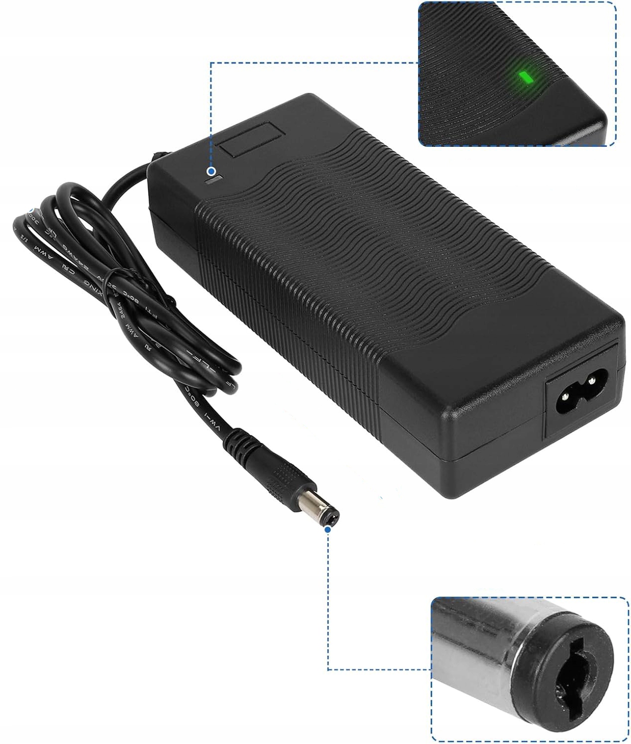 Przed zakupem upewnij się, że napięcie (54,6V) oraz jeden z dostępnych typów wtyczek w zestawie jest zgodny z wymaganiami Twojego urządzenia! Ładowarka jest dedykowana do baterii litowych o napięciu znamionowym 24-48V.