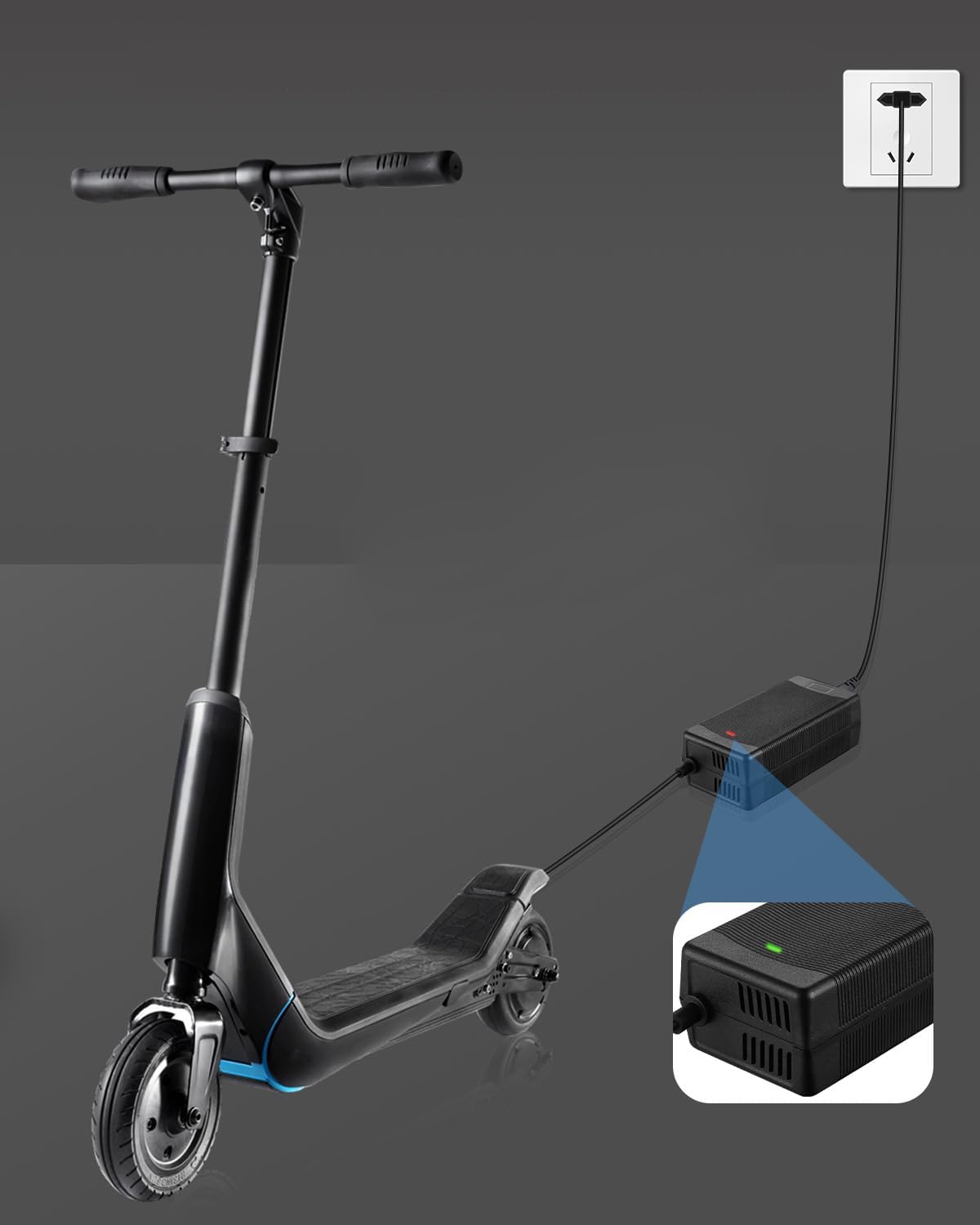 Konstrukcja bezpieczeństwa diody LED ładowarki automatycznie zatrzymuje ładowanie po zakończeniu, aby uniknąć uszkodzenia baterii skutera elektrycznego, zapewnić bezpieczeństwo ładowania.