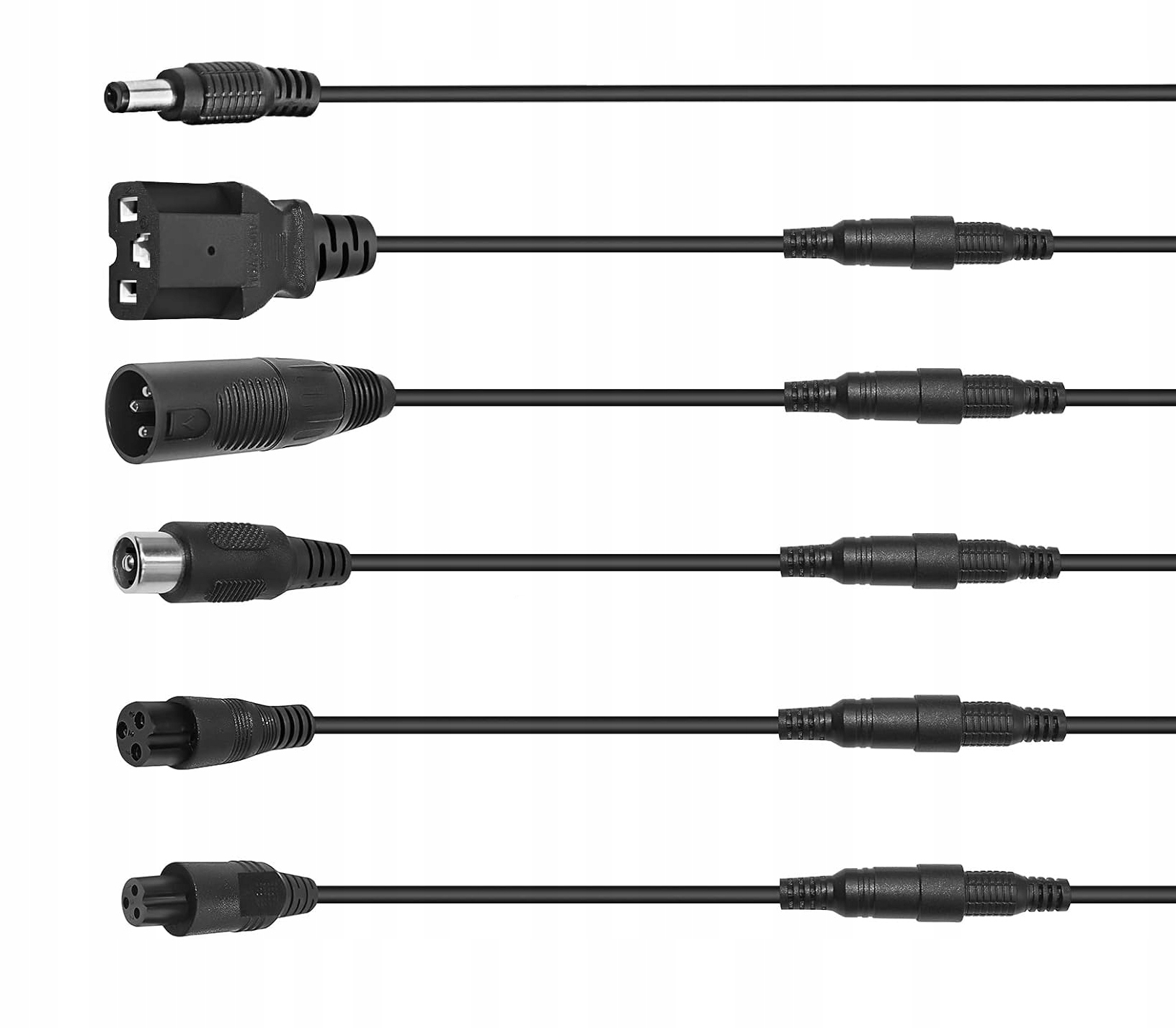 Dzięki dołączonym wymiennym wtyczkom (DC, RCA, XLR, i inne widoczne na zdjęciu) ładowarka Lextool pasuje do ogromnej większości hulajnóg elektrycznych, rowerów elektrycznych oraz innych pojazdów zasilanych akumulatorami litowymi 24-48V.