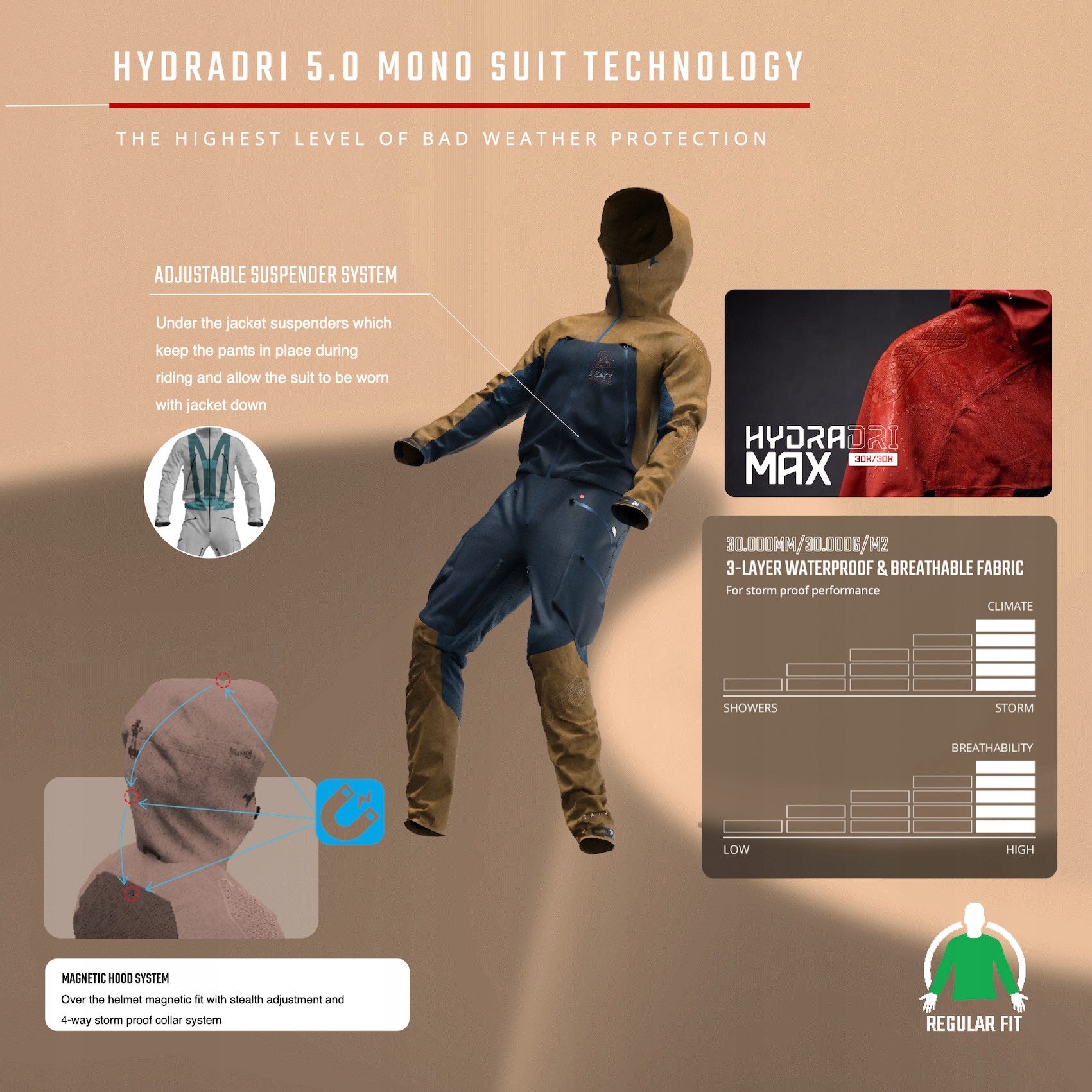Wykonany z najwyższej jakości trójwarstwowej membrany Leatts Hydradri MAX, wodoodpornego i oddychającego materiału 30.000/30.000 z regulowaną wentylacją i powłoką odporną na brud/wodę/zabrudzenia, sprawdzi się w każdych warunkach pogodowych.