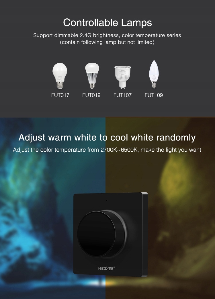 MiBoxer K1 to elegancki, dotykowy pilot ścienny do sterowania oświetleniem LED CCT (regulowana biel: ciepła ↔ zimna). Obsługuje 1 strefę, umożliwia ściemnianie oraz regulację temperatury barwowej. Działa bezprzewodowo (RF 2.4GHz), bez potrzeby prowadzenia kabli sterujących.