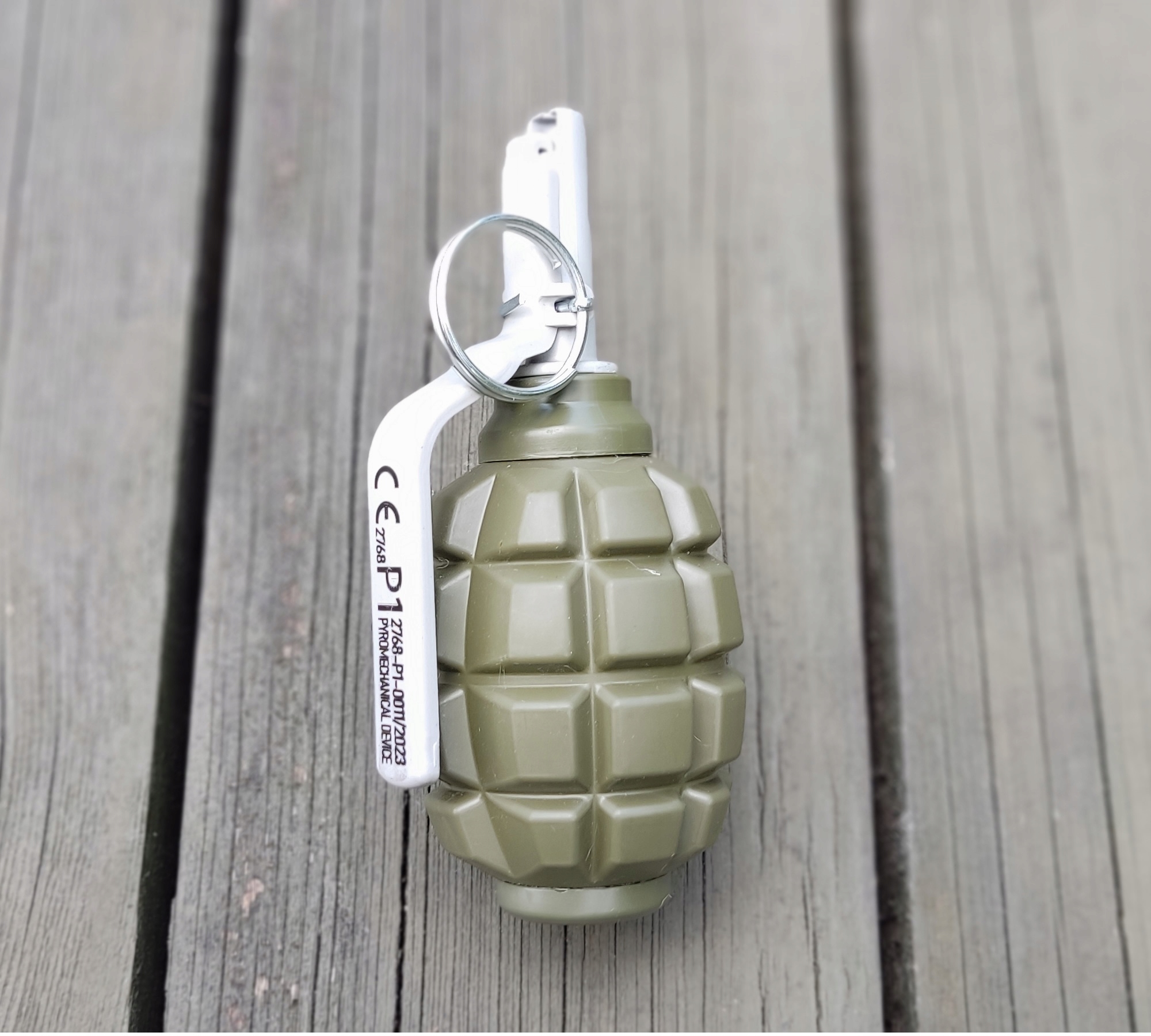 Symulacyjno-treningowy granat, aktywowany przez wyciągnięcie zawleczki. Do użycia w szkoleniach militarnych, rekonstrukcjach, zrzutach z dronów oraz bezpiecznej nauki posługiwania się granatem typu F1.