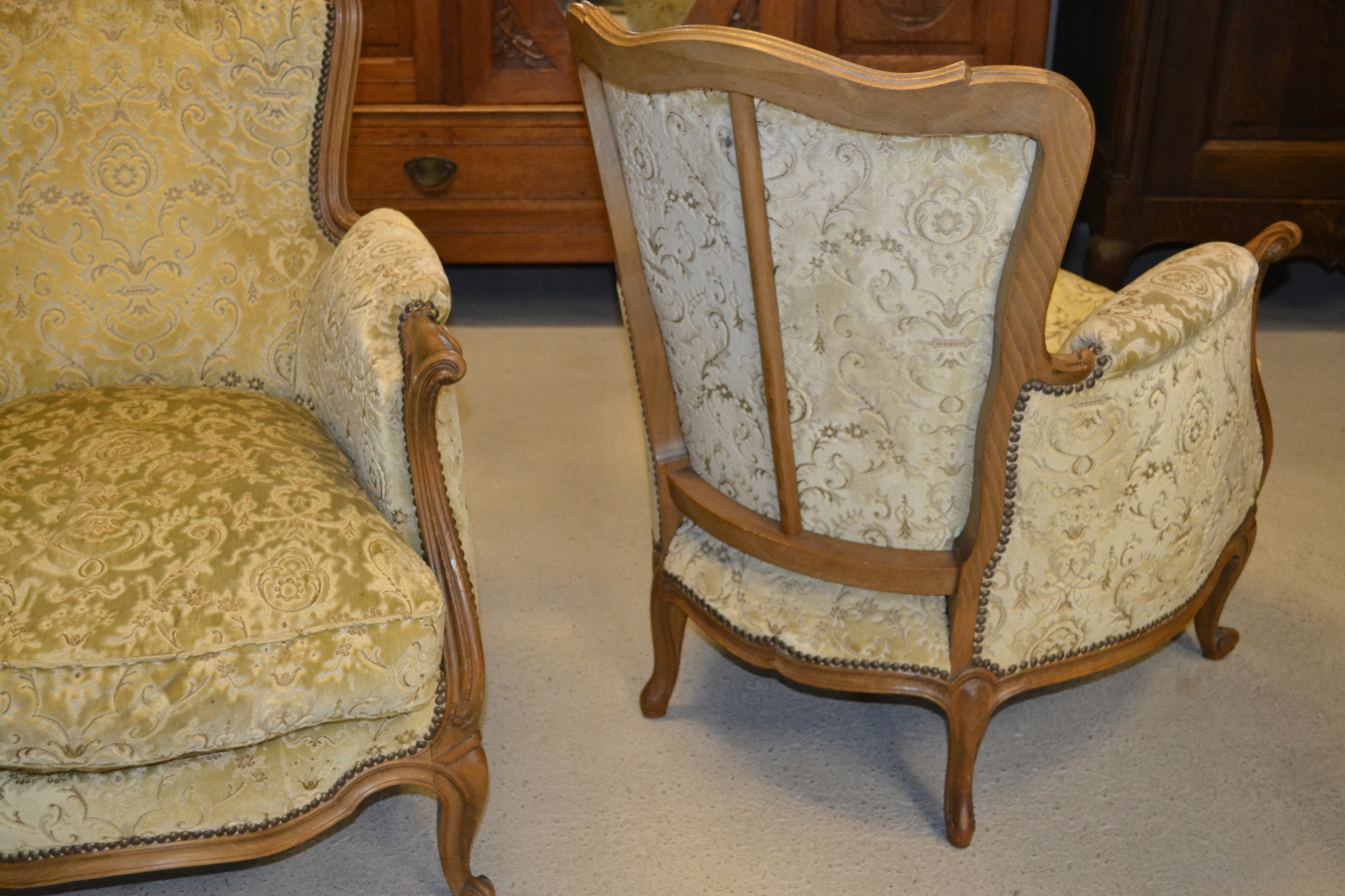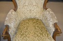 piękne ,nie wielkie fotele berżera . pochodzenie francja . meble mają ładnie wymodelowane kształty .ramy są zdobione snycerką . tapicerka wykończona pineską . ramy ładne ,stabilne . meble wyglądają ładnie ,ale tapicerka jest powycierana na oparciach . na tym materiale jest to niewiele widoczne i meble można tak używać ,ale do ideału trochę brakuje . stan, stan dobry lub do odnowienia tapicerka .