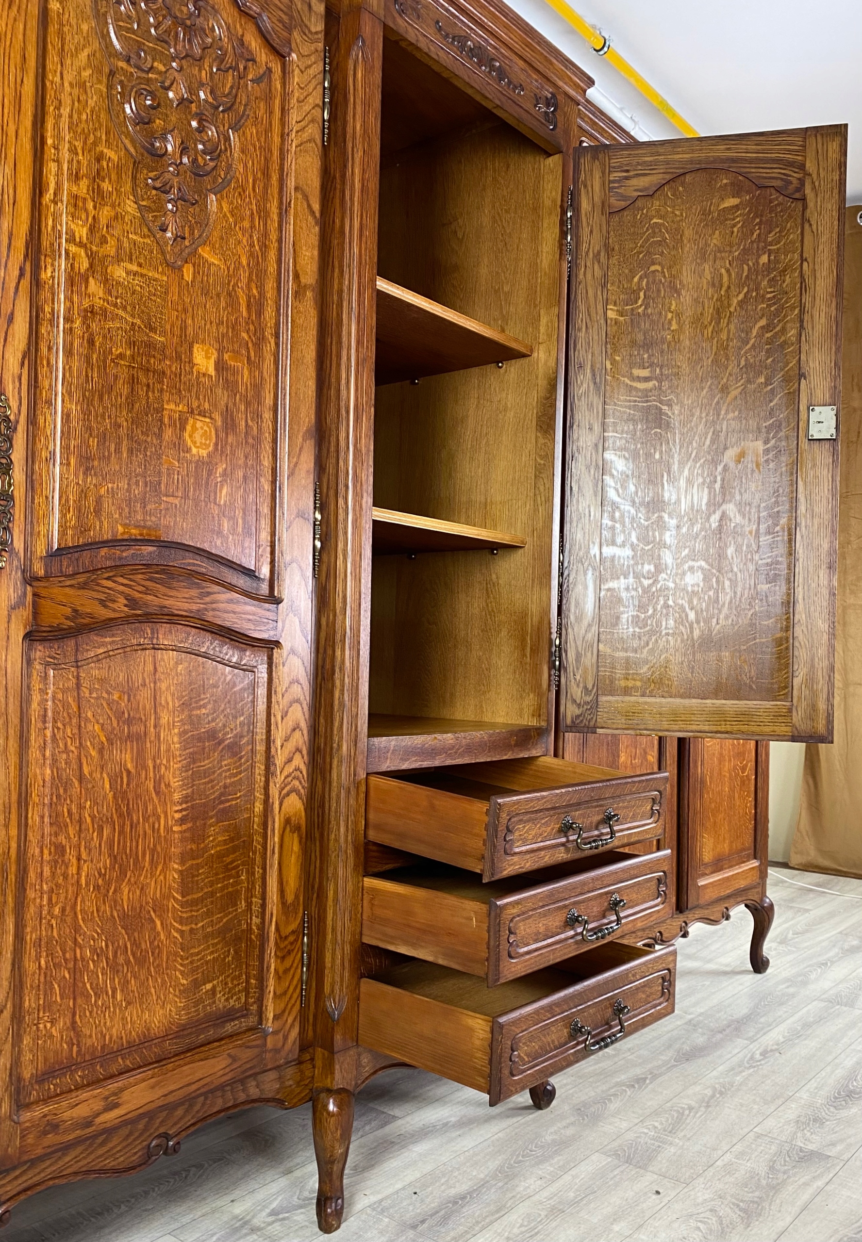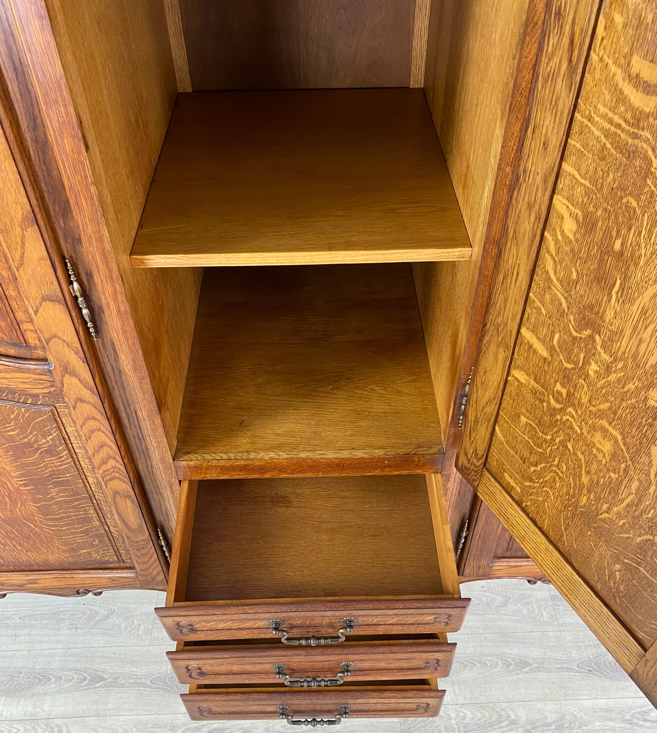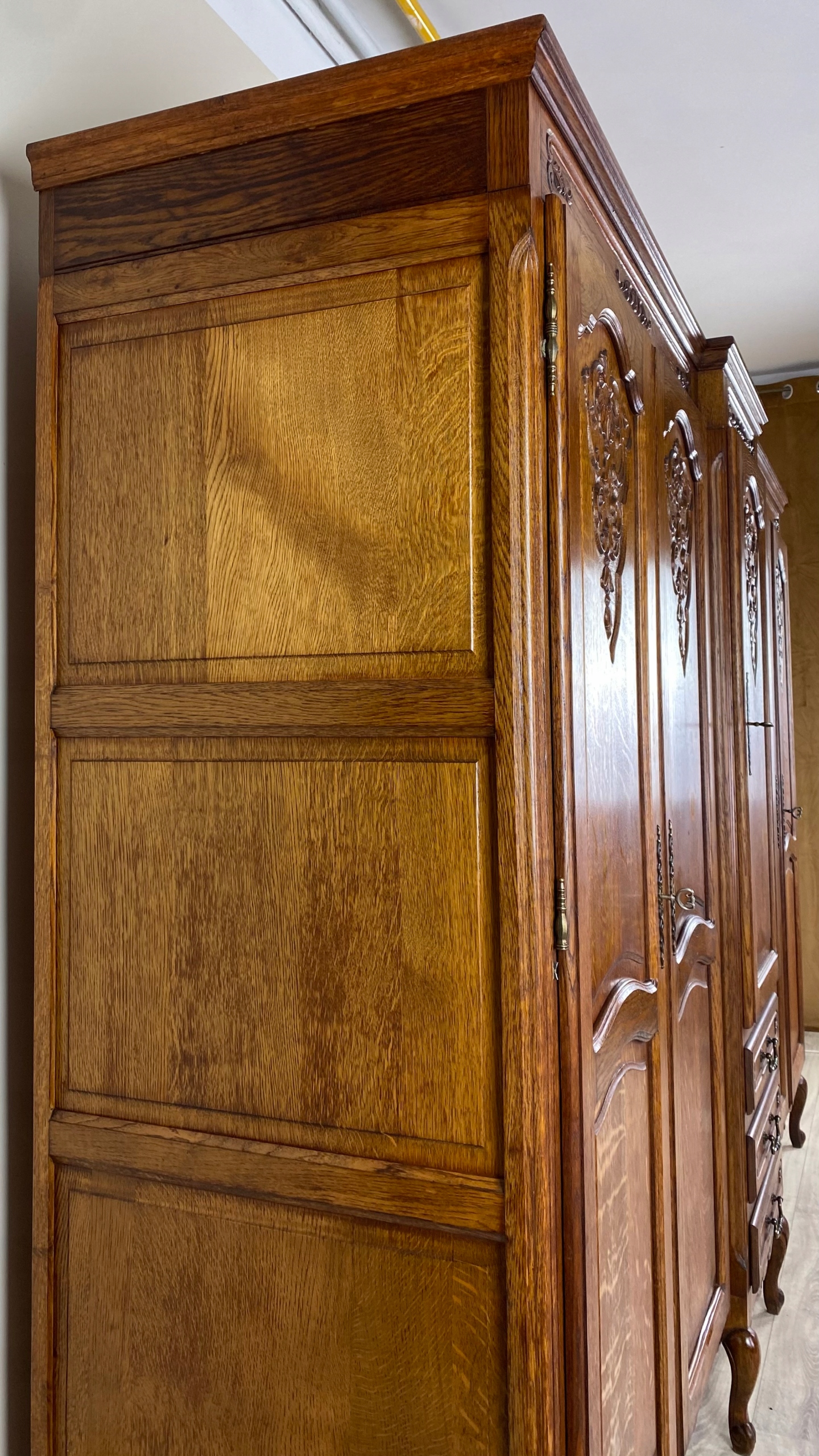 Szafa czterodrzwiowa wykonana z fornirowanego drewna dębowego oraz drewna dębowego.