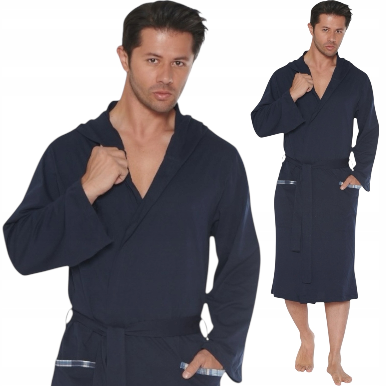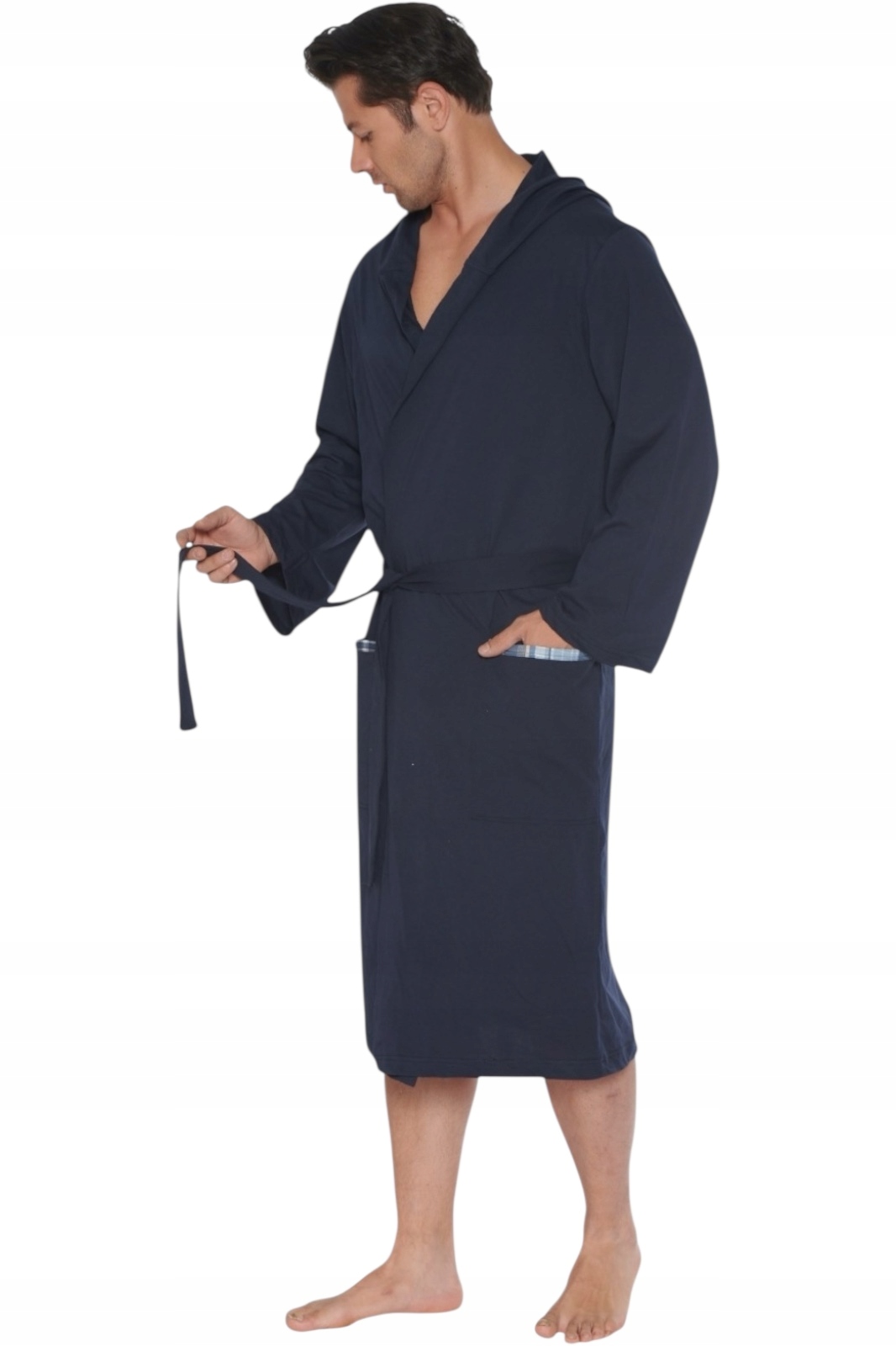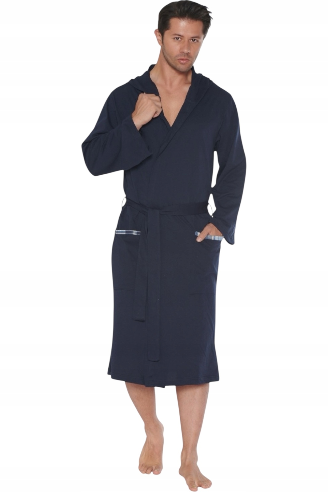 Gładki, dłuższy szlafrok z bawełny, kaptur, kieszonki.