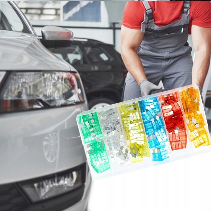 ▶ Zestaw bezpieczników samochodowych zapakowany w praktyczne plastikowe pudełko.