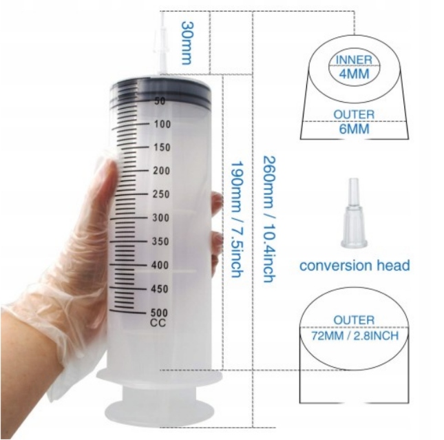 ️✔️【Duży zestaw strzykawek】 1 szt. 500 ml strzykawek 1 szt. 100 cm sterylny cewnik do lewatywy 1 szt konwerter kalibru rozmiaru. Każda duża strzykawka jest indywidualnie zamykana, czysta, bezpieczna i sterylna. Strzykawka wykonana jest z wysokiej jakości materiału, mocna, trwała i wielokrotnego użytku.