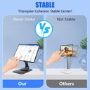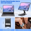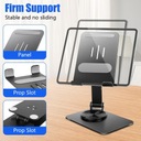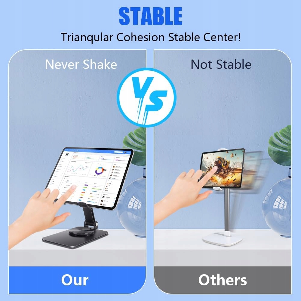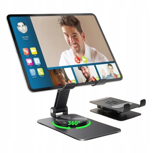 Stojak na tablet z obrotową podstawą umożliwia pełny obrót o 360 stopni oraz regulację wysokości i kąta. Możliwość ustawienia urządzenia zarówno pionowo, jak i poziomo zapewnia komfort oglądania i pisania w każdej pozycji.