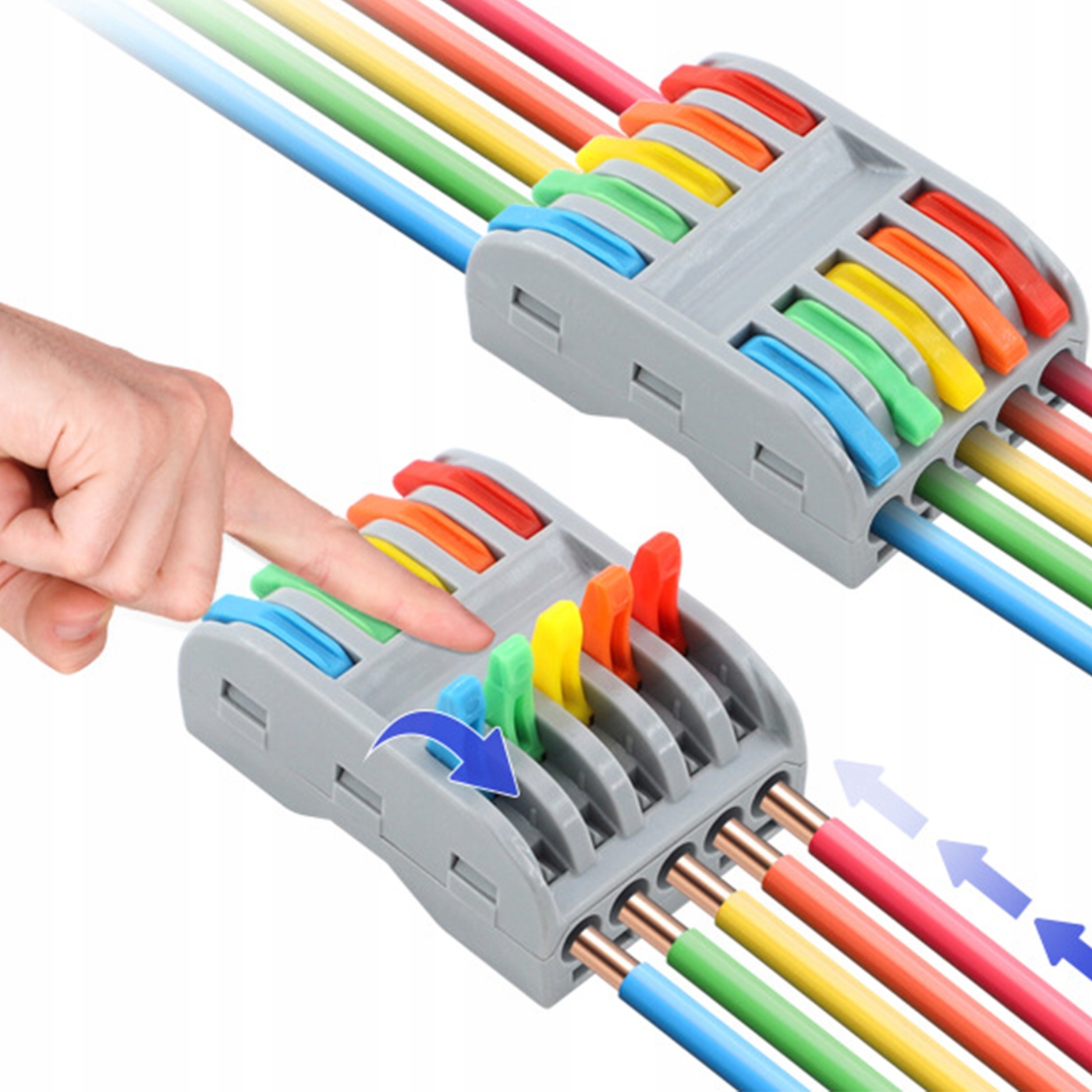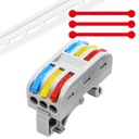 Szybkozłączka kablowa przeznaczona do montażu na szynie DIN, umożliwiająca szybkie i łatwe połączenie przewodów w instalacjach elektrycznych. Każda złączka cechuje się dwoma punktami połączeń (1P+1P). Kolorowe oznaczenia ułatwiają identyfikację przewodów.