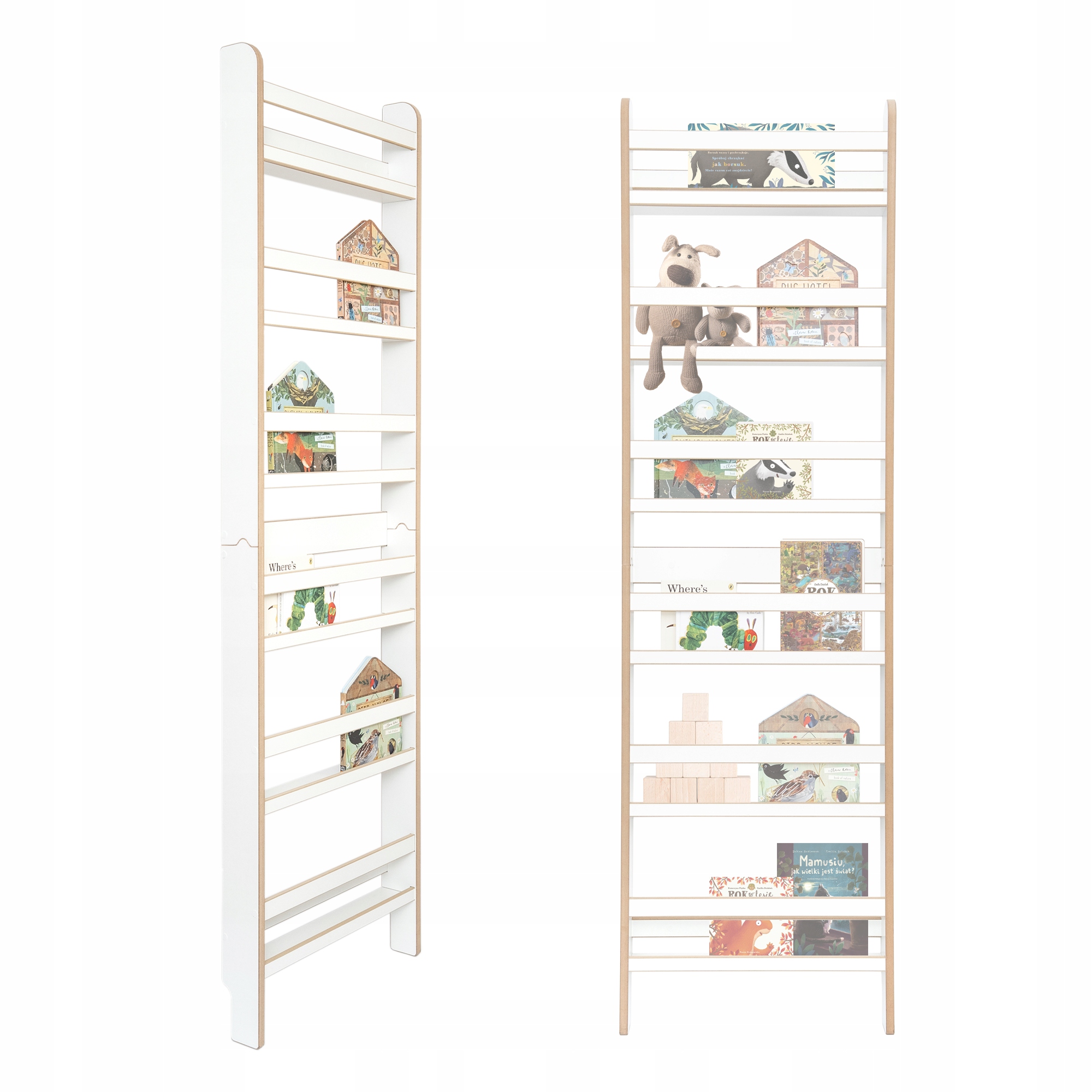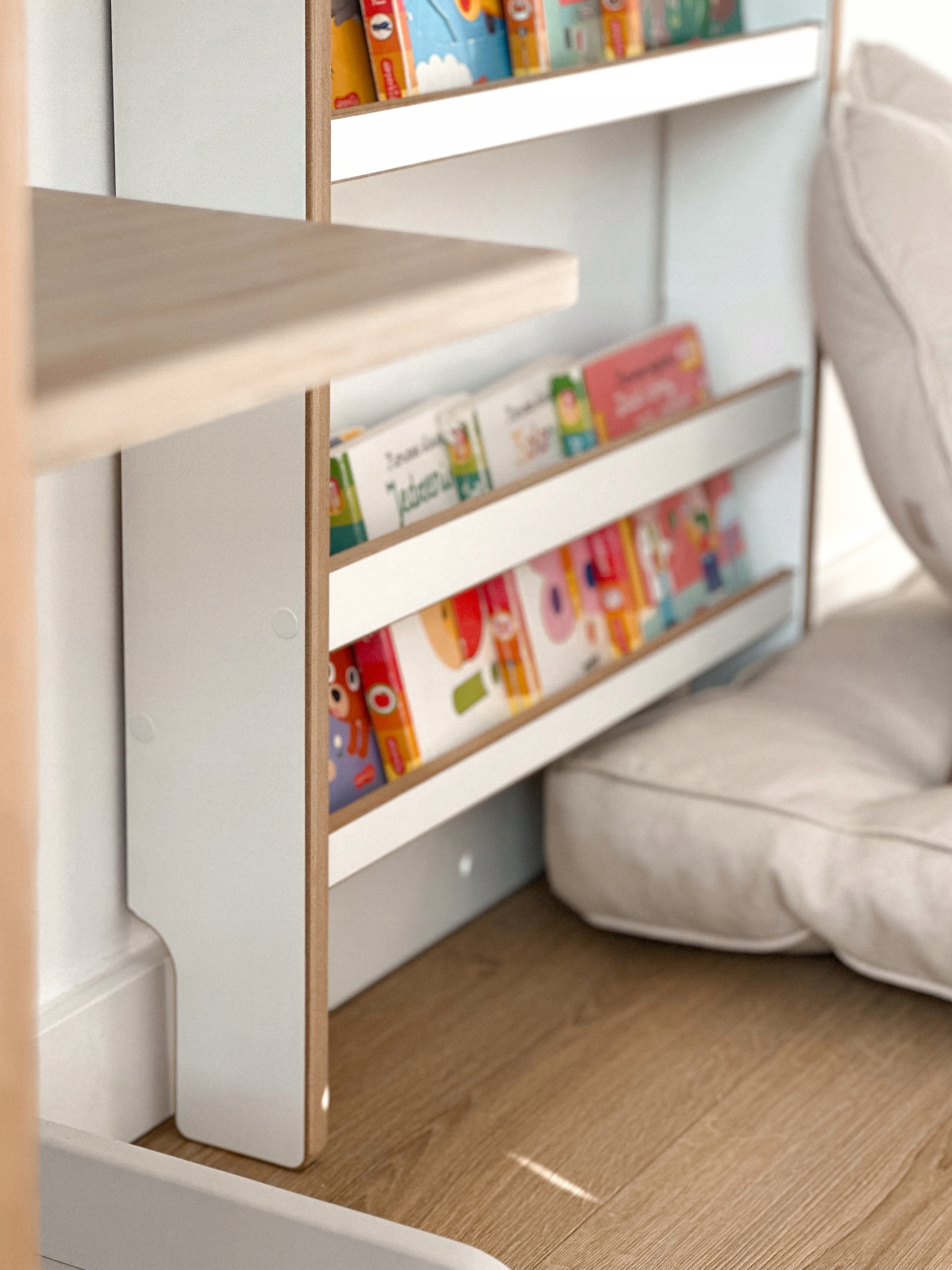 Otwarta konstrukcja regału zachęca dziecko do samodzielnego wyboru i odkładania książek, rozwijając poczucie odpowiedzialności i porządku. Układ półek sprzyja przejrzystej organizacji przestrzeni, a estetyczna forma uczy harmonii i dbałości o otoczenie — zgodnie z zasadami metody Montessori.