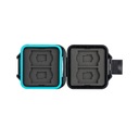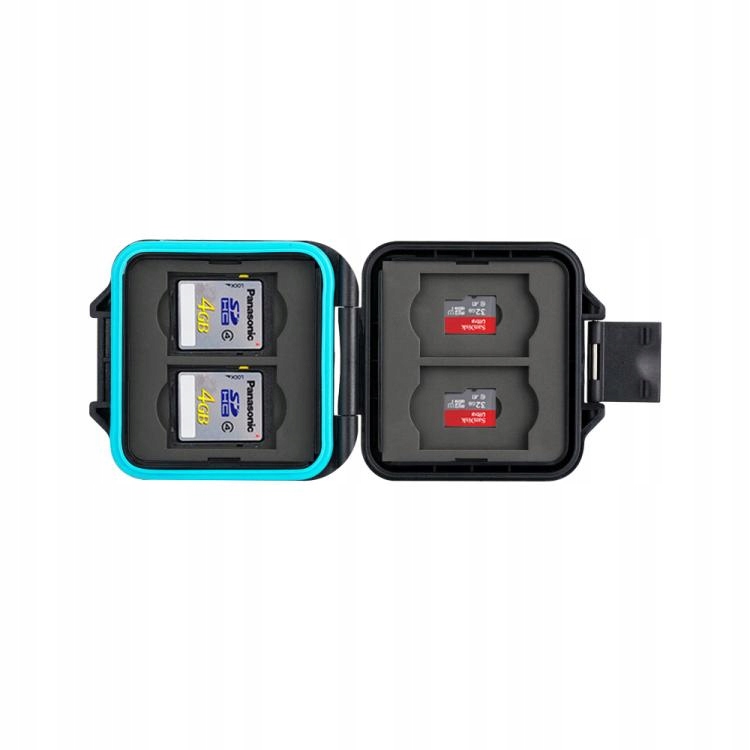 Wodoodporny pokrowiec na karty SD. Wykonany jest z tworzywa poliwęglanowego o wysokiej odporności mechanicznej. Etui zabezpiecza karty także przed wodą i kurzem. Wypraska z elastycznej gumy z przegródkami na karty dodatkowo zabezpiecza karty przed uszkodzeniami mechanicznymi, a także pewnie przytrzymuje karty, uniemożliwiając wypadanie i mieszanie się.