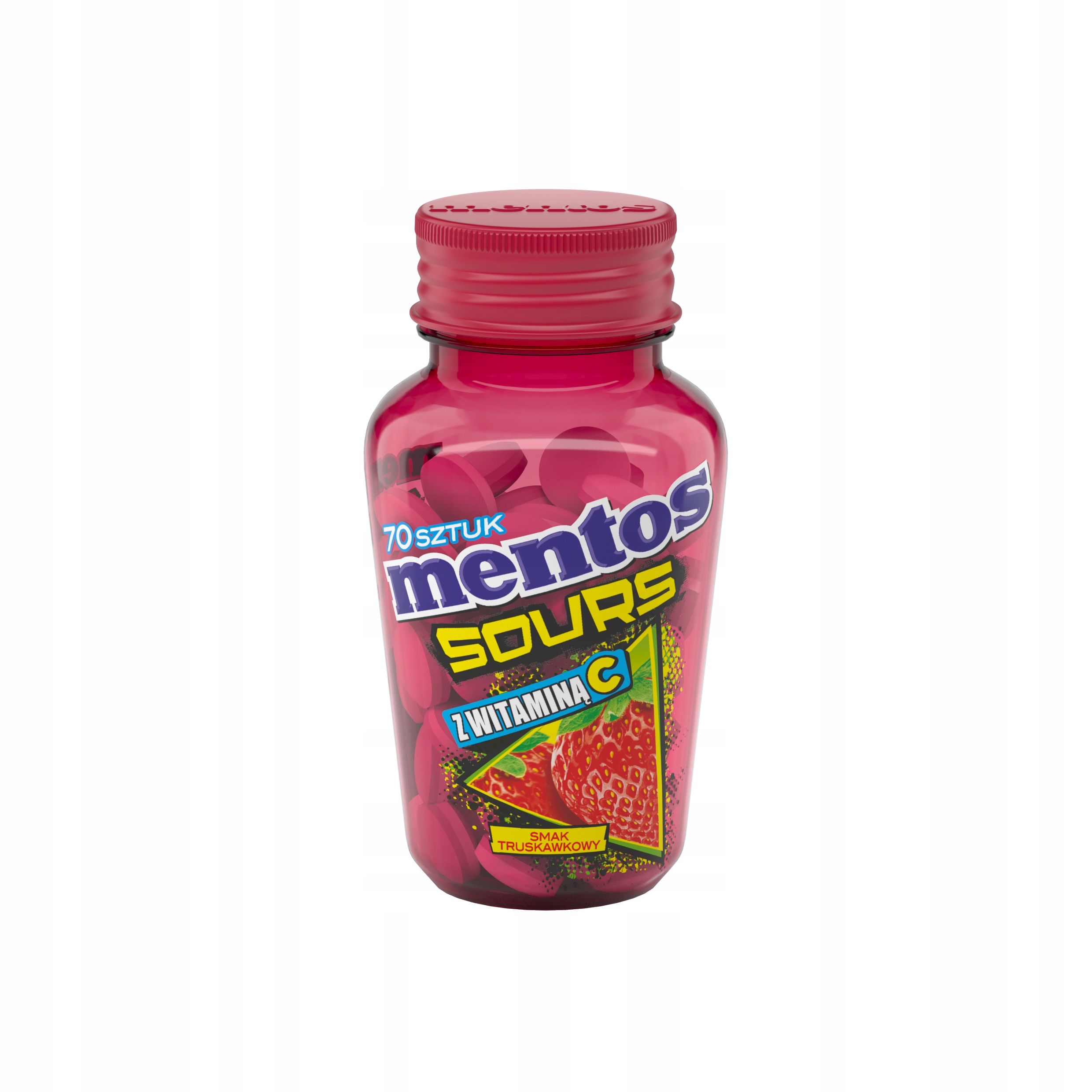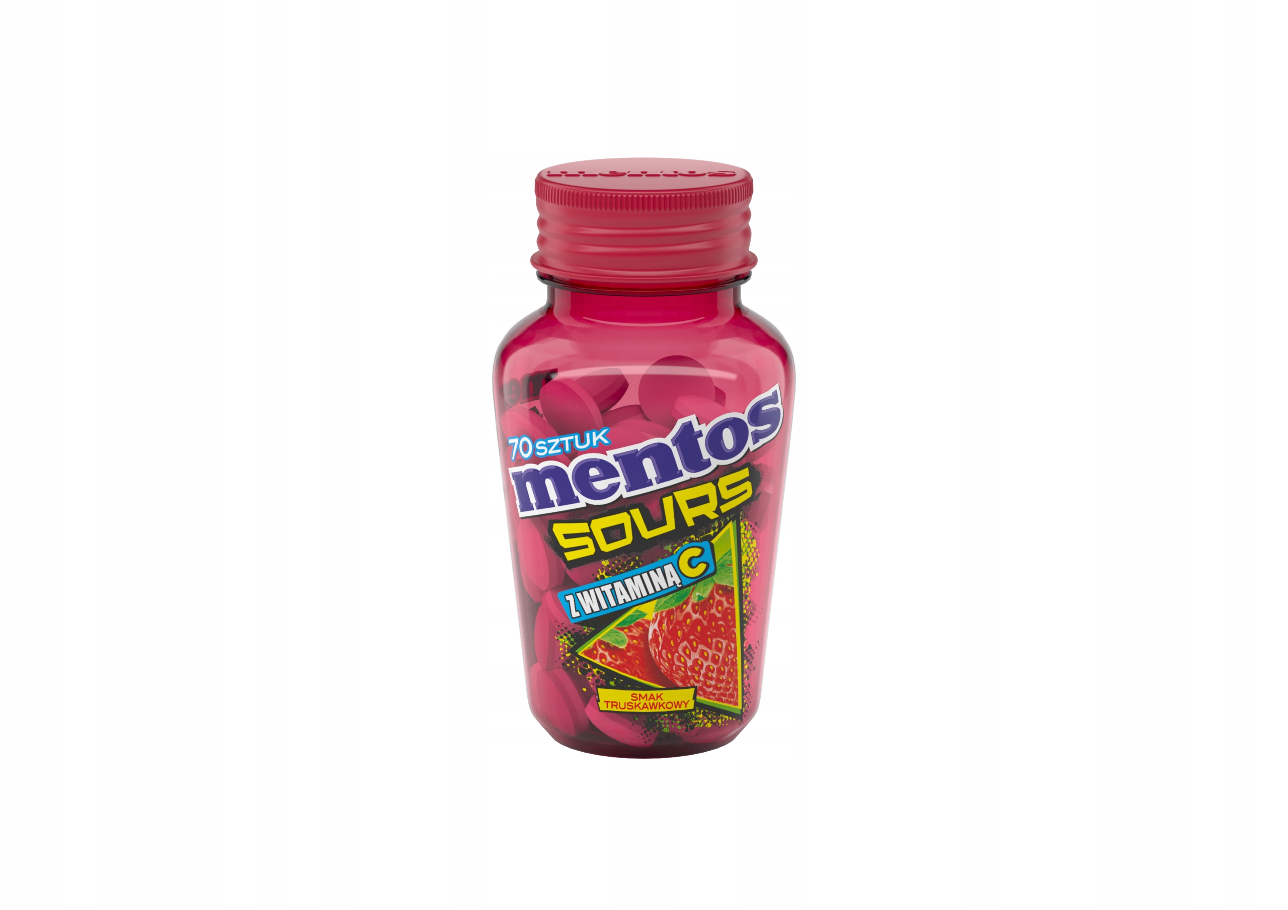 Wypróbuj unikalnej nowości od marki MENTOS. Kwaśne pastylki bez cukru o smaku truskawki wzbogacone o witaminę C. Aż 70 cukierków w jednej wyjątkowej butelce.