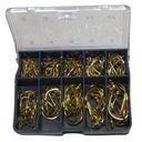 Zestaw 100 haczyków wędkarskich w 10 różnych rozmiarach z oczkiem w kolorze złotym. Haczyki to niezbędny element wyposażenia każdego wędkarza. Wykonane ze stali węglowej, kute i galwanizowane na kolor złoty. Haczyki są w możliwie najlepszej rozmiarówce, można powiedzieć na każdą rybę. Haczyki posiadają oczko co ułatwia ich wiązanie. Haczyki są zapakowane w praktyczne pudełko dla łatwego przechowywania i transportu. Ten zestaw to idealne rozwiązanie dla wędkarzy o różnych preferencjach i technikach połowu.