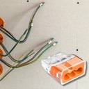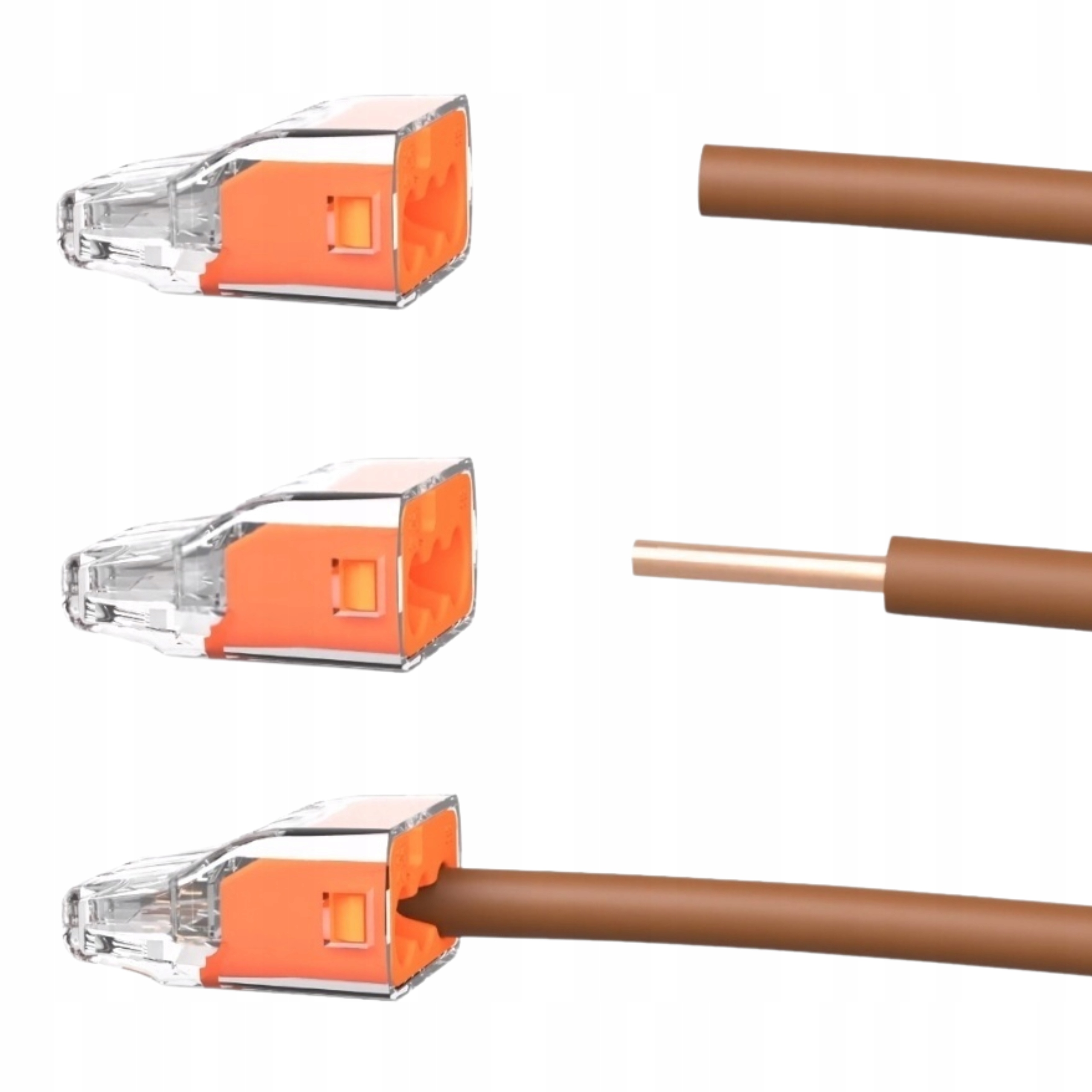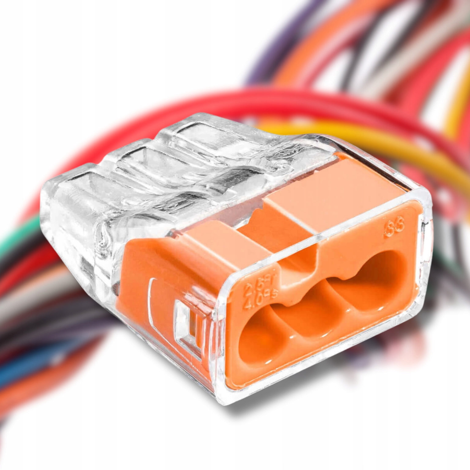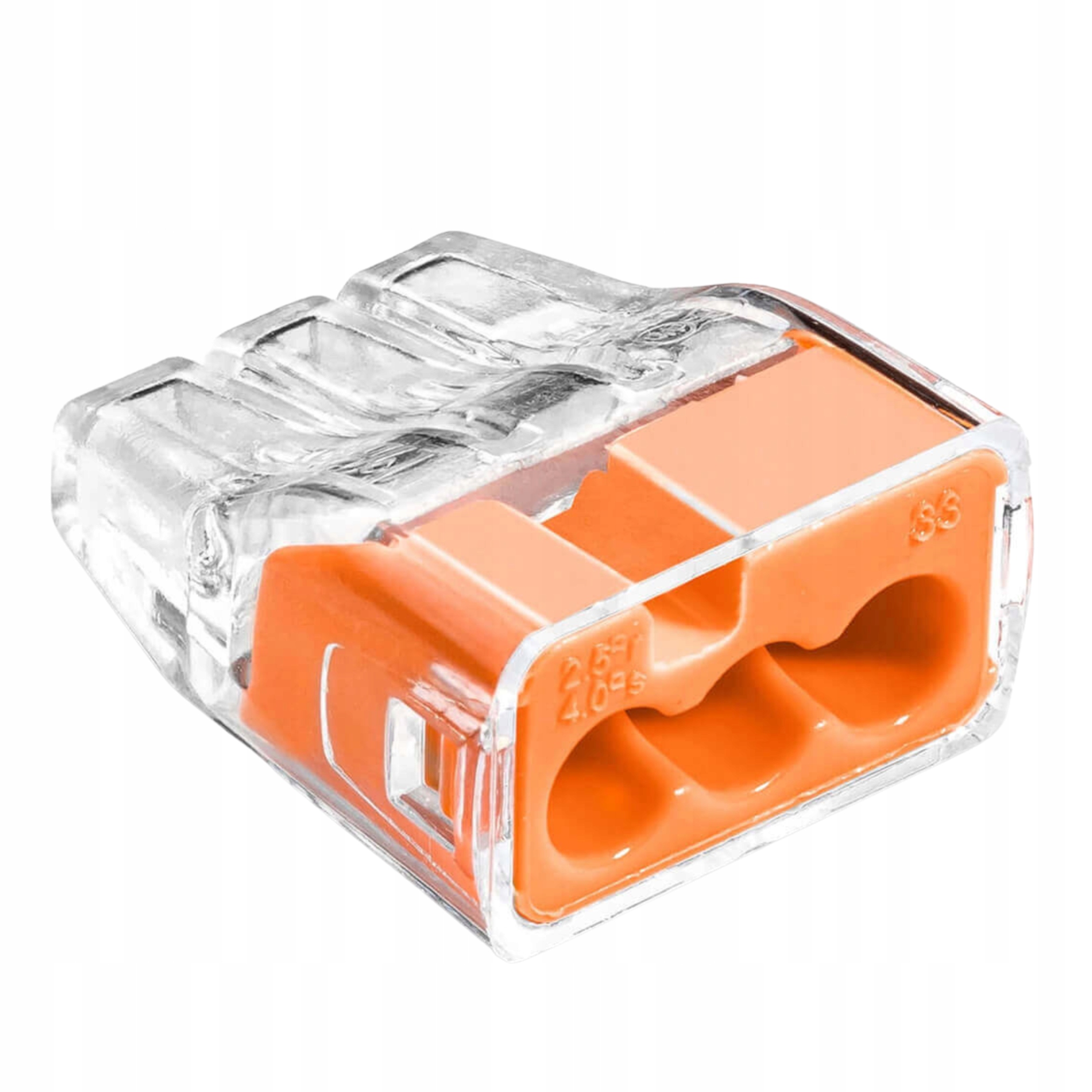 SIMET IDEALNA Szybkozłączka SCP3 Wtykowa Do Drutów 3-Torowa 88001008 – 10 szt. to praktyczne i niezawodne szybkozłączki wtykowe, umożliwiające szybkie i trwałe łączenie przewodów jedno- i wielodrutowych o przekroju od 0,75 do 4 mm². Transparentna, pomarańczowa obudowa zapewnia łatwą kontrolę wizualną połączenia, a ergonomiczny kształt gwarantuje wygodę montażu. Produkt sprawdzi się doskonale w instalacjach elektrycznych w puszkach, rozdzielnicach oraz obudowach.