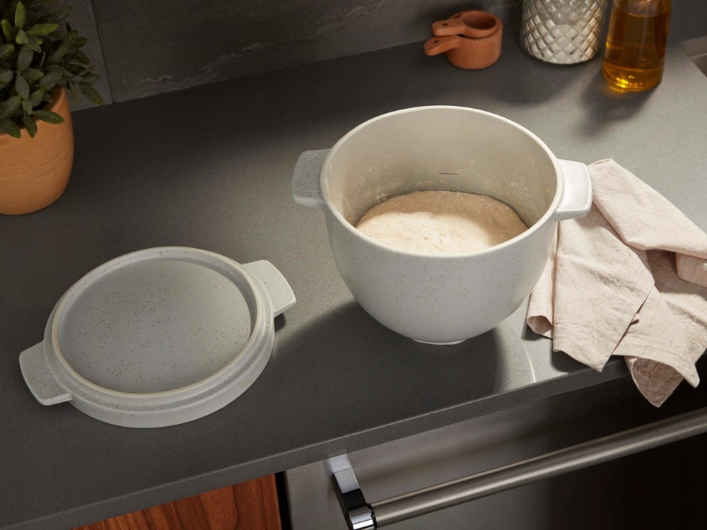 Praktyczny pojemnik do pieczenia chleba o pojemności 4,7 l umożliwia przygotowanie wypieków od przygotowania ciasta w mikserze do pieczenia w piekarniku. Podczas pieczenia pokrywa pojemnika utrzymuje parę podczas pieczenia, podobnie jak piekarniki parowe.