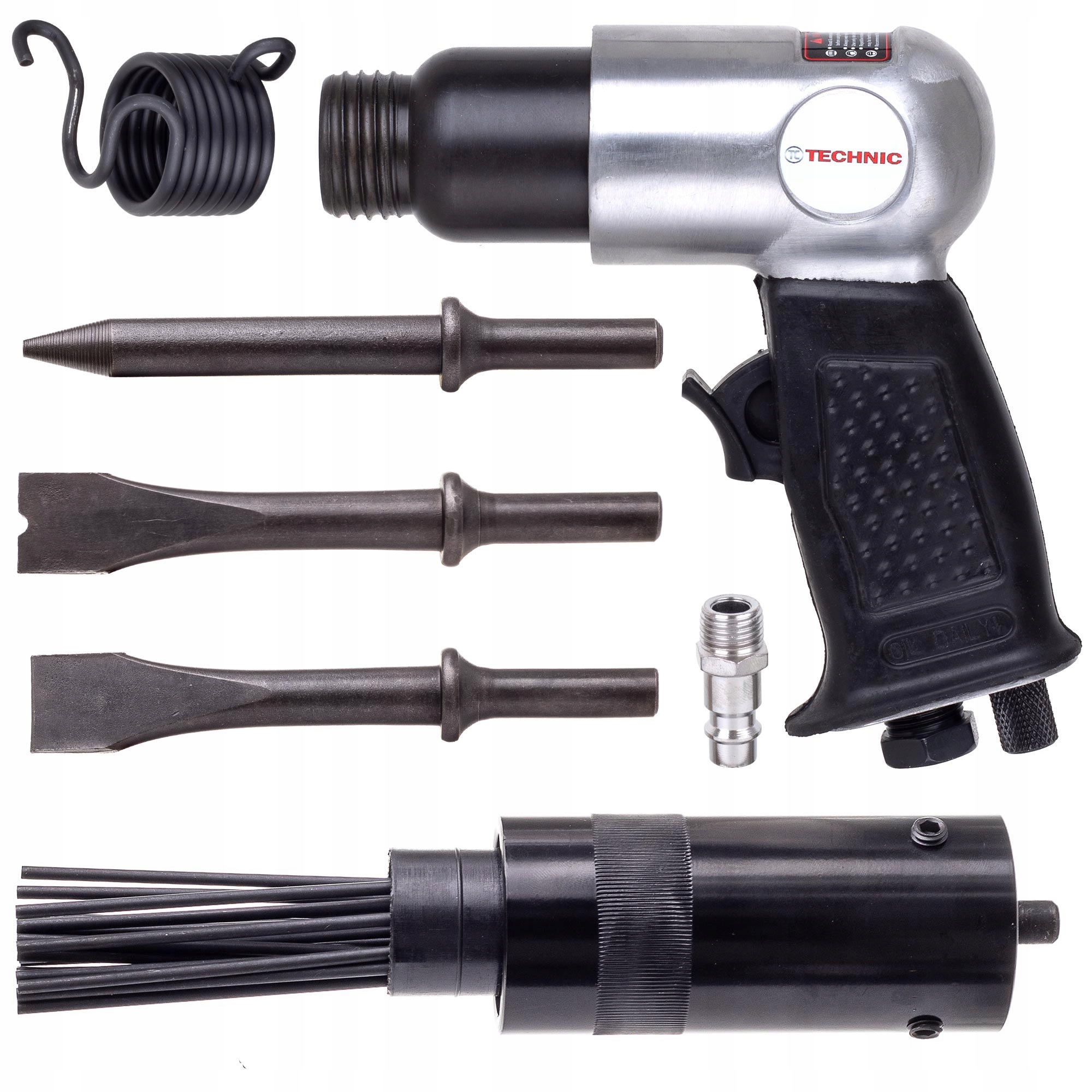 W wyposażeniu standardowym, komplet igieł o średnicy 3 mm (18 cm) oraz 3 groty (12 cm). Ogromną zaletą jest pistoletowy kształt młotka, pozwalający na lepszy docisk do czyszczonej powietrzni,dodatkowo jest niewielkiej wagi co pozwala na swobodną i długotrwałą pracę z tym narzędziem. Okrągłe gniazdo na dłuta sprawia, że końcówki w nim umieszczone nie są blokowane i podczas uderzeń mogą się obracać.