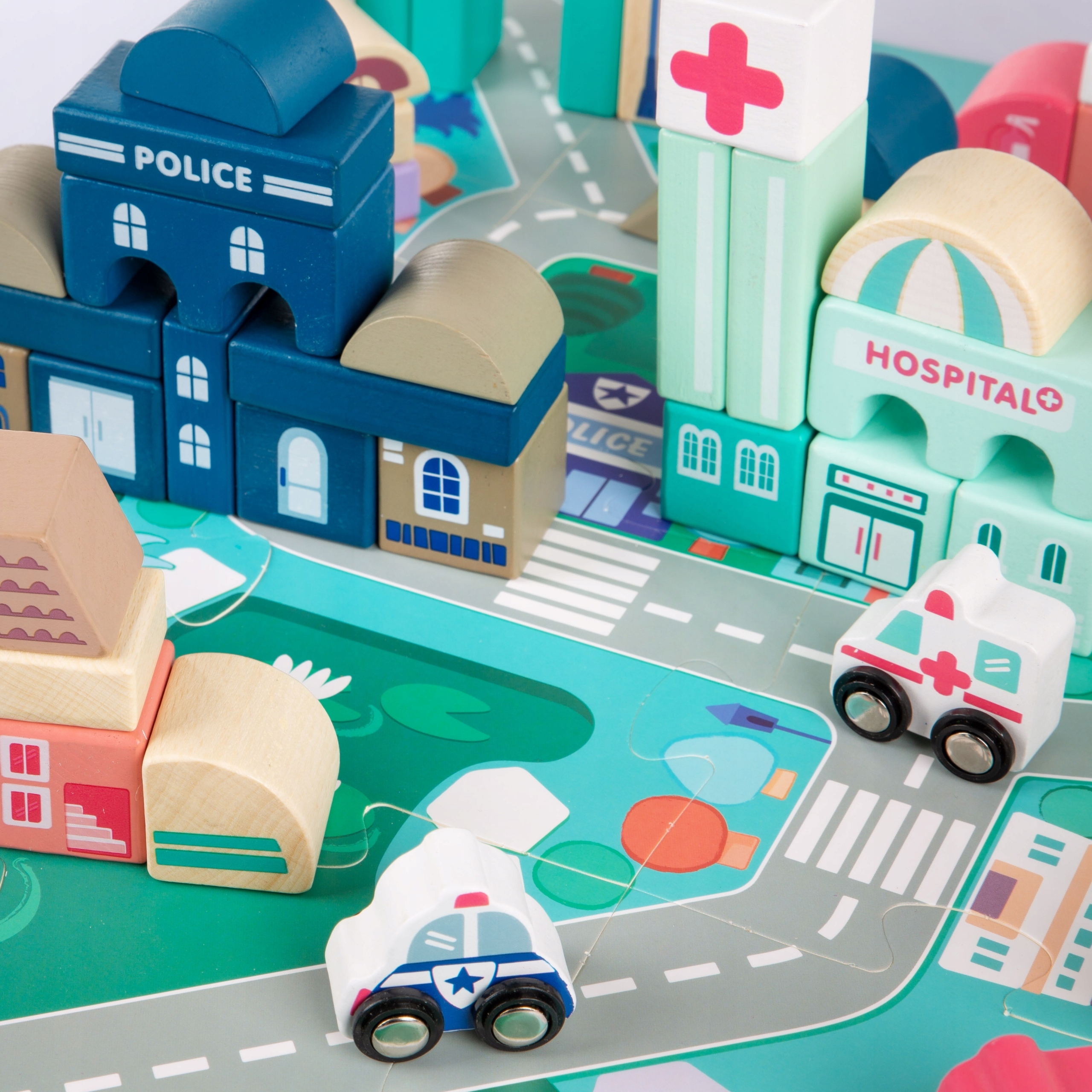 W zestawie znajduje się wszystko, czego potrzeba do stworzenia funkcjonalnego miasta. Dziecko może zbudować komisariat policji, sklep, szpital, muzeum, bank, księgarnię, szkołę, remizę strażacką, przytulną kawiarnię oraz hotel. Po ulicach, które powstaną na specjalnej macie, będą mogły poruszać się dołączone pojazdy: karetka, radiowóz policyjny, wóz strażacki, autobus szkolny i samochód firmy ochroniarskiej, a nad miastem unosić się będzie helikopter. Dodatkowe klocki w różnych kształtach i kolorach oraz elementy z literkami i cyferkami urozmaicą zabawę.