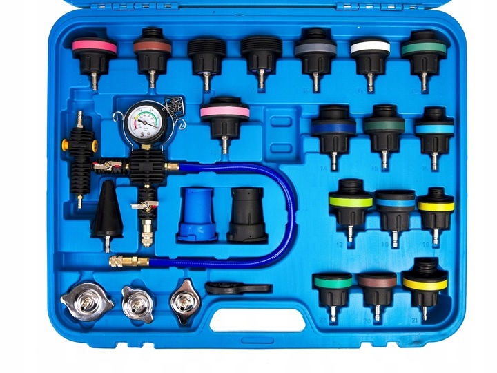 27 elementowy zestaw do testowania przecieków w chłodnicy, a tak że dokonania szybkiej zmiany chłodziwa.