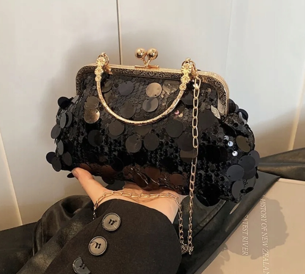 Uwagi dodatkowe długość łańcuszka ok 120 cm, elegancka cekinowa w złotej oprawie na bankiet wesele sylwestra