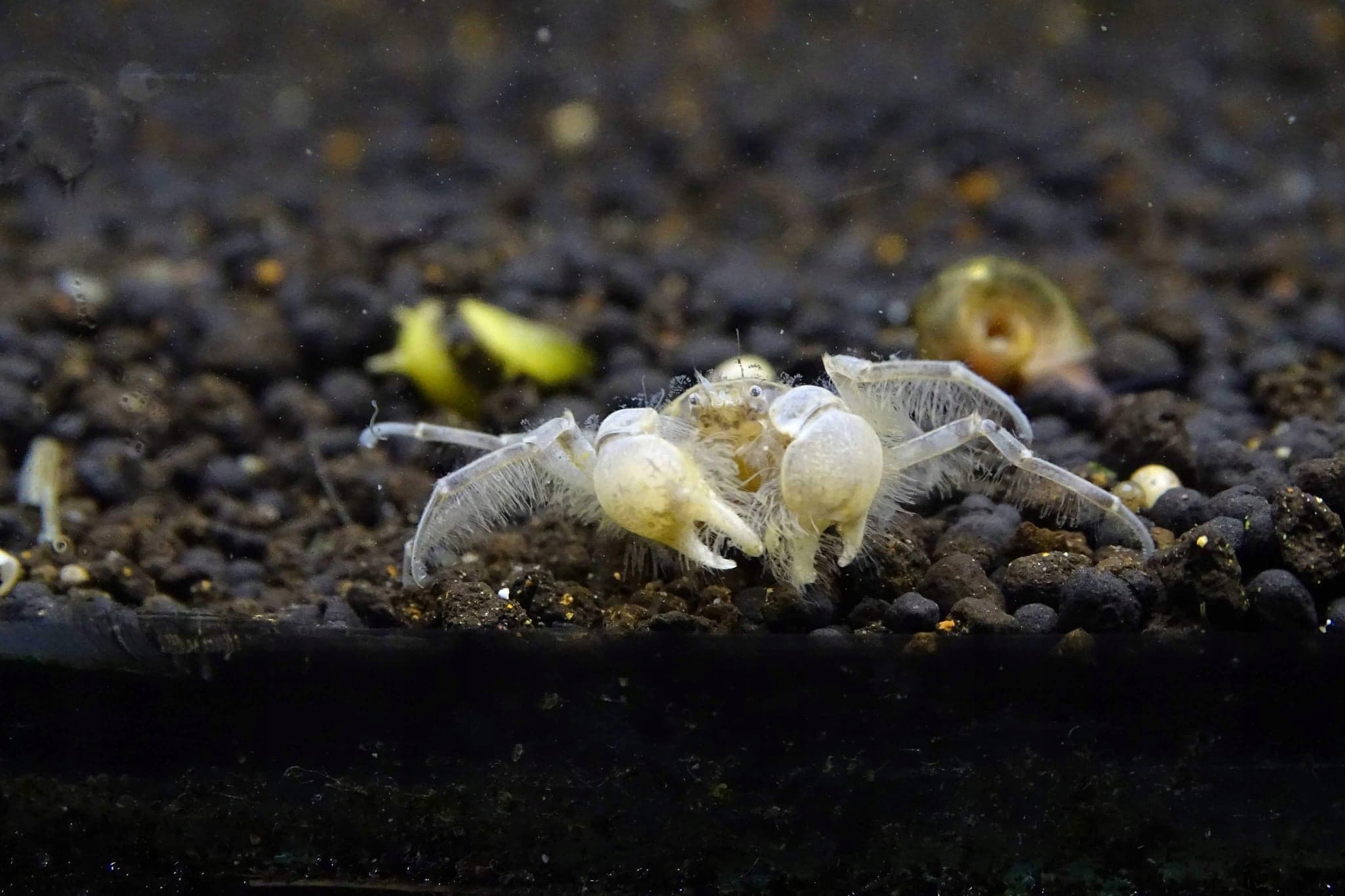 Opis:Dorosły krab dorasta do 1cm (długość pancerza). Posiada długie odnóża obrośnięte mikro włoskami. Możemy go znaleźć w różnych odmianach kolorystycznych kremowy,ciemno brązowe oraz szare.