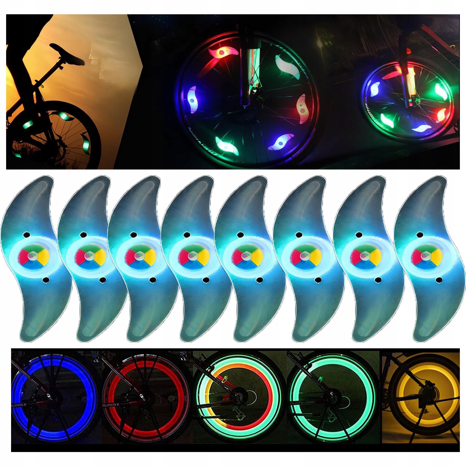 W zestawie: 8 kolorowych świateł na szprychy, w tym baterie. Rozmiar produktu pokazano na lewym zdjęciu (pomiar ręczny, występuje błąd 1-2 cm).
