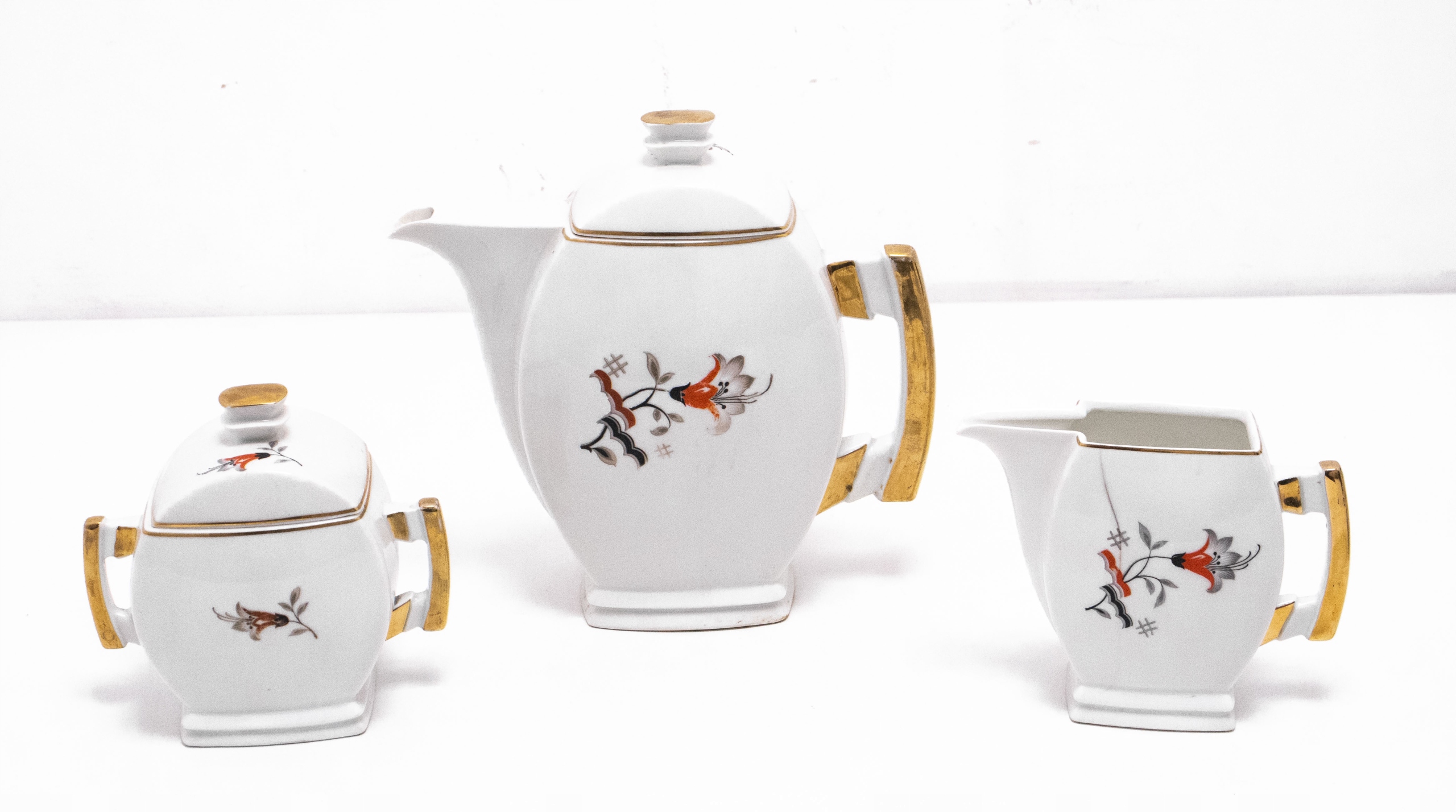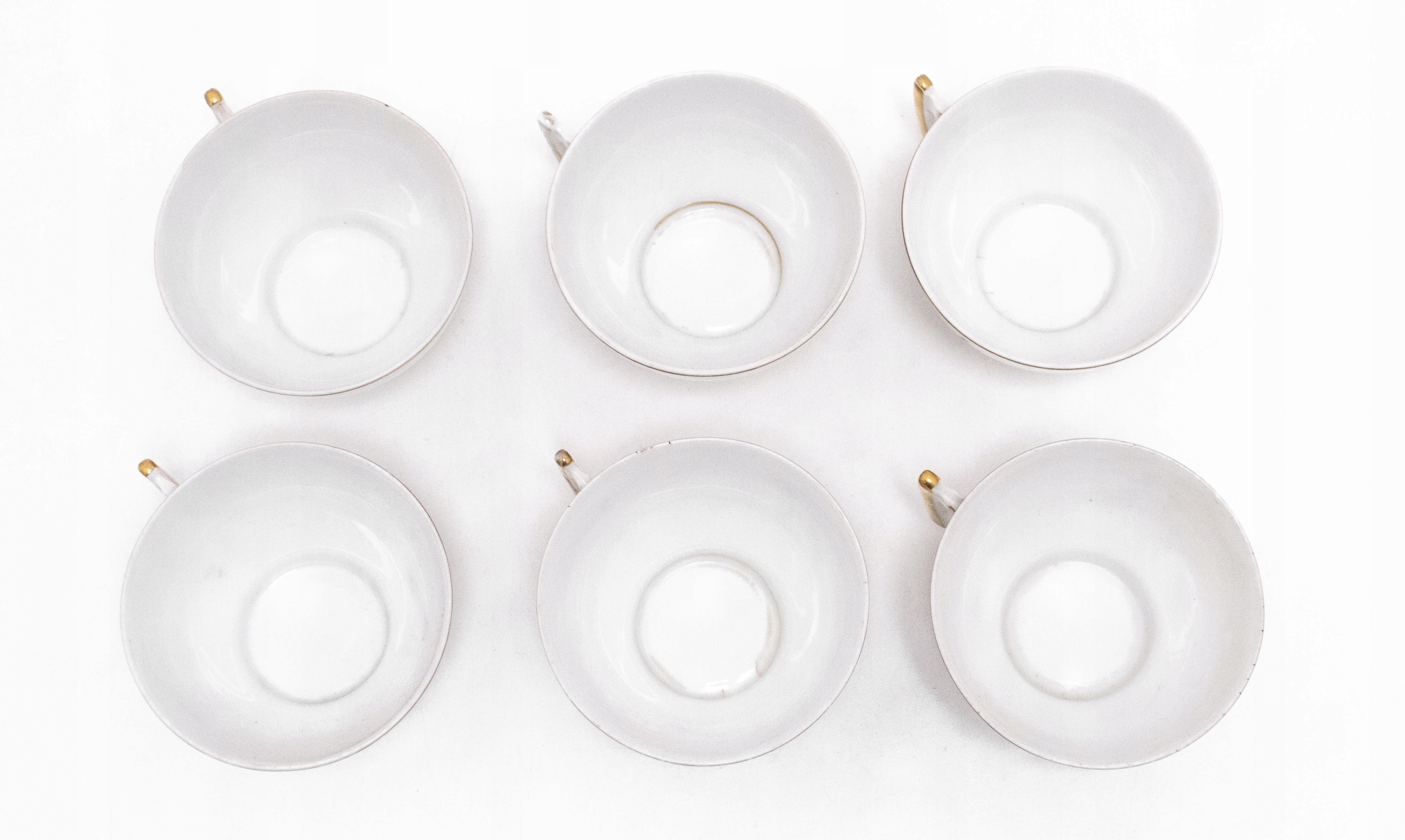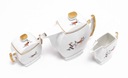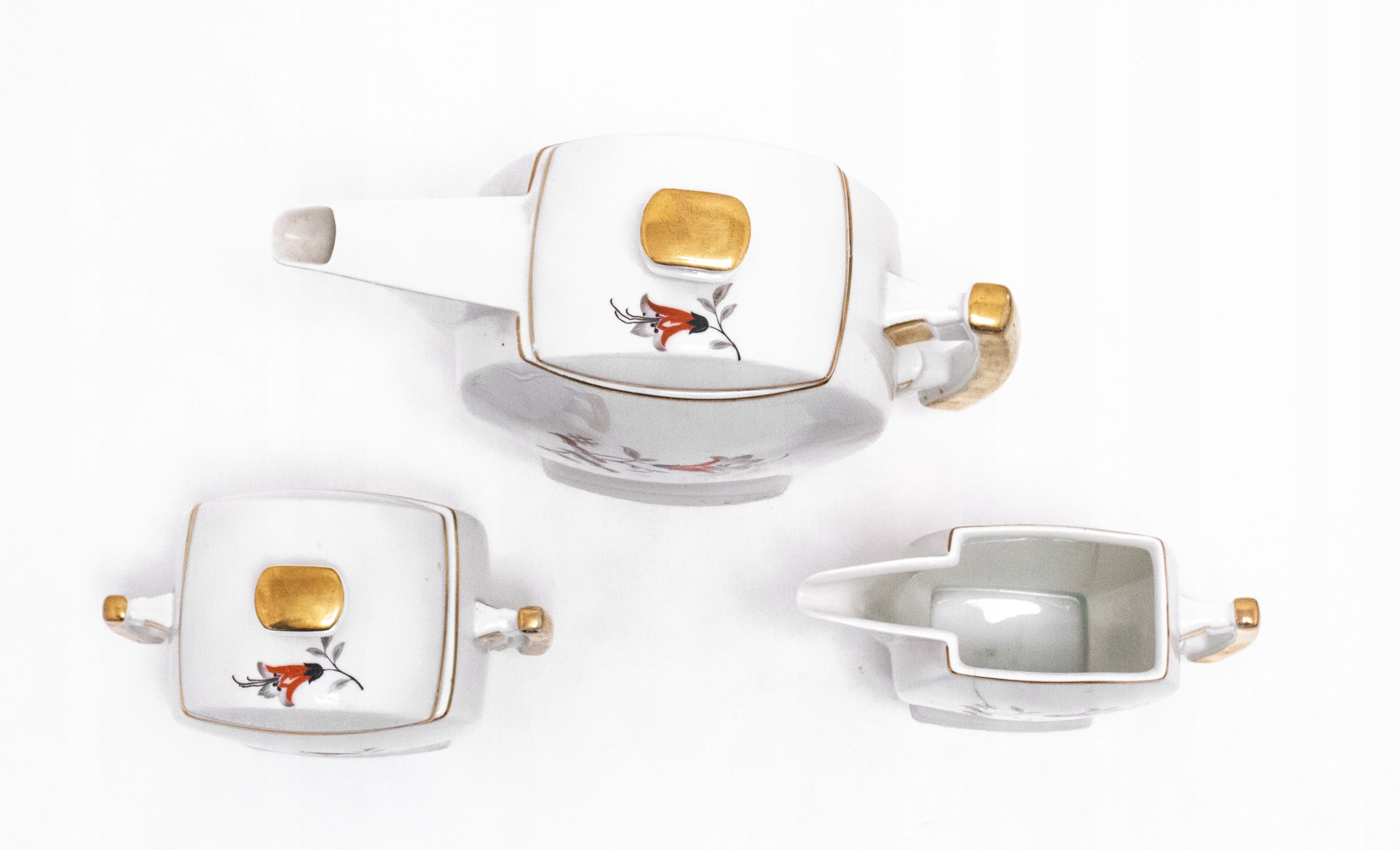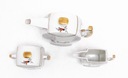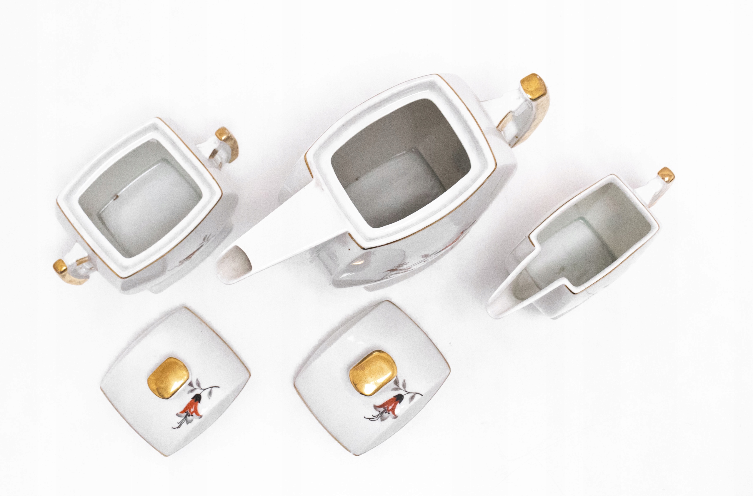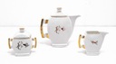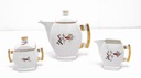 Набор используется, имеет следы использования в виде мелких царапины и ссадины, местами потертые украшения, трещина на молочнике.