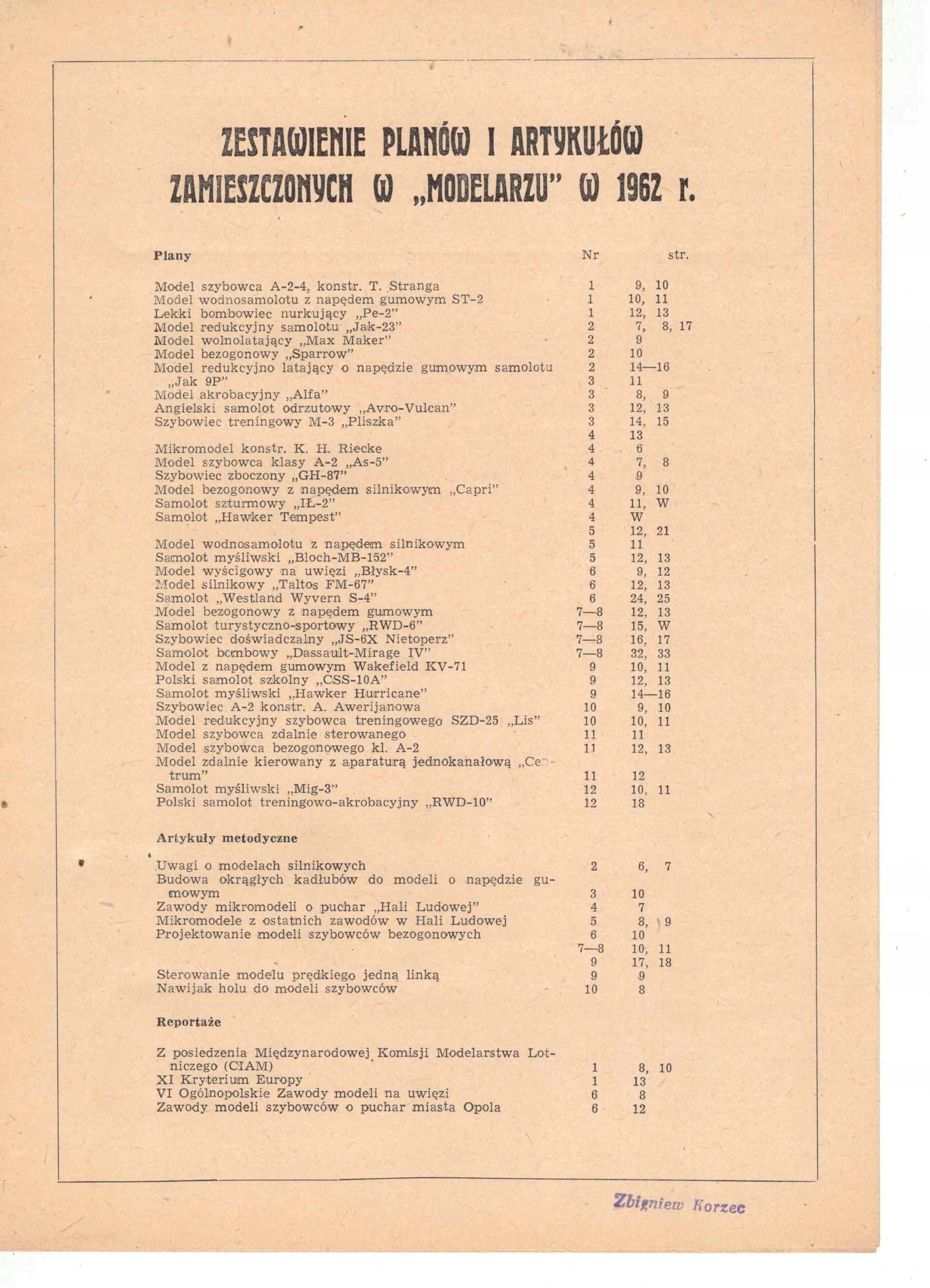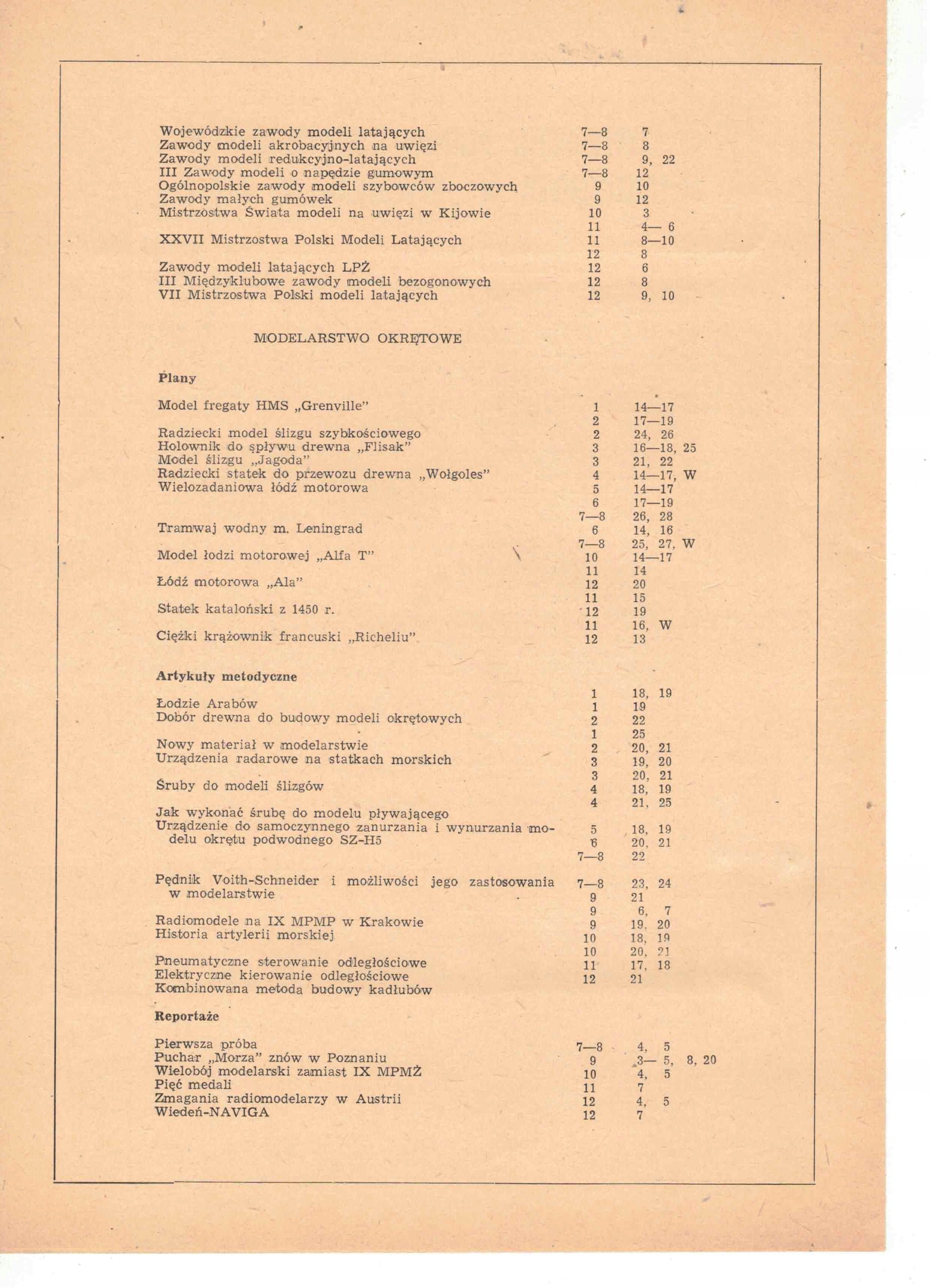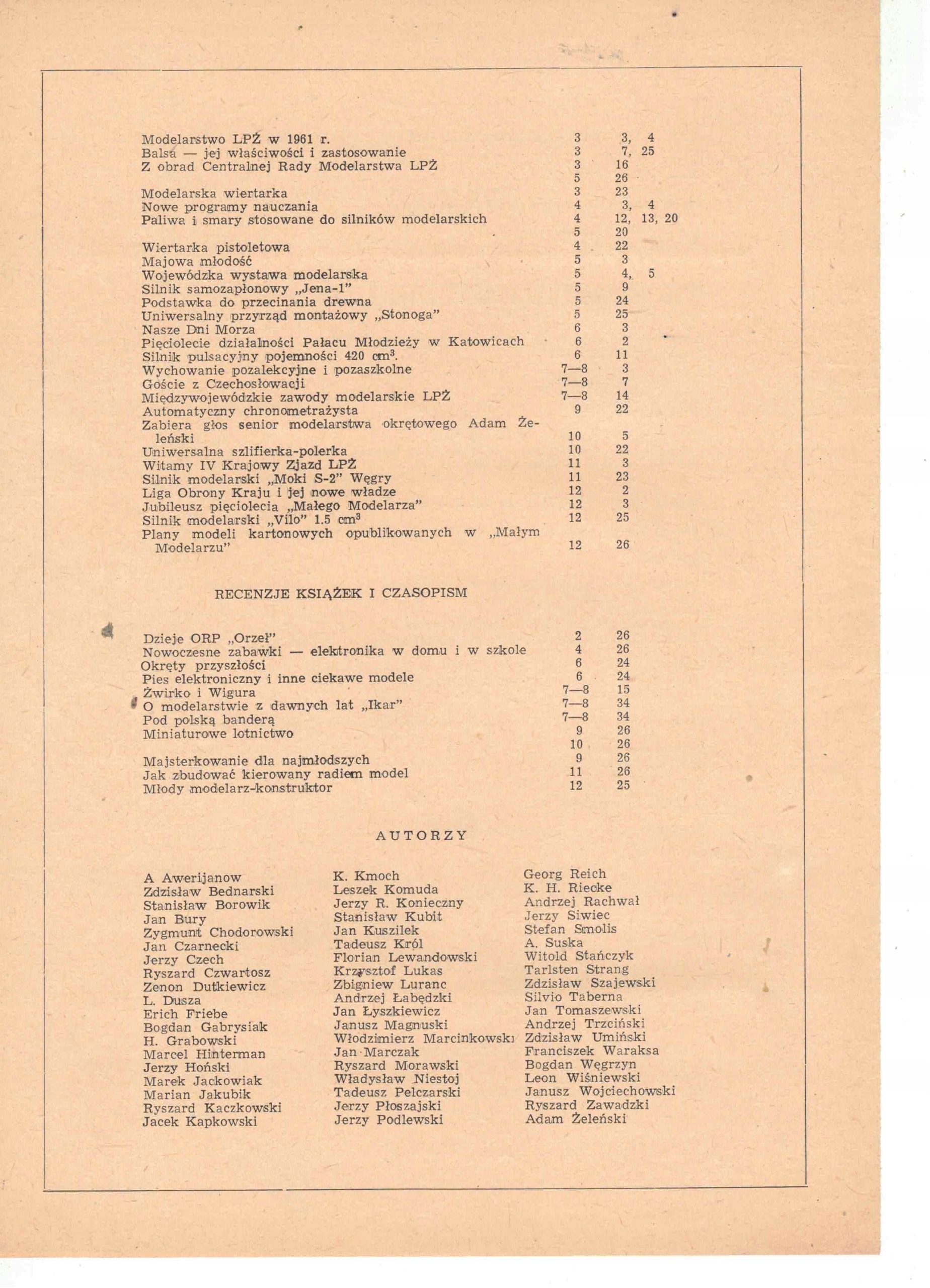 "Modelarz - Miesięcznik LOK dla modelarzy Wydawnictwo: ZG Ligi Obrony Kraju Objętość: str 28; Spis treści rocznika z 1962 roku na zdjęciach