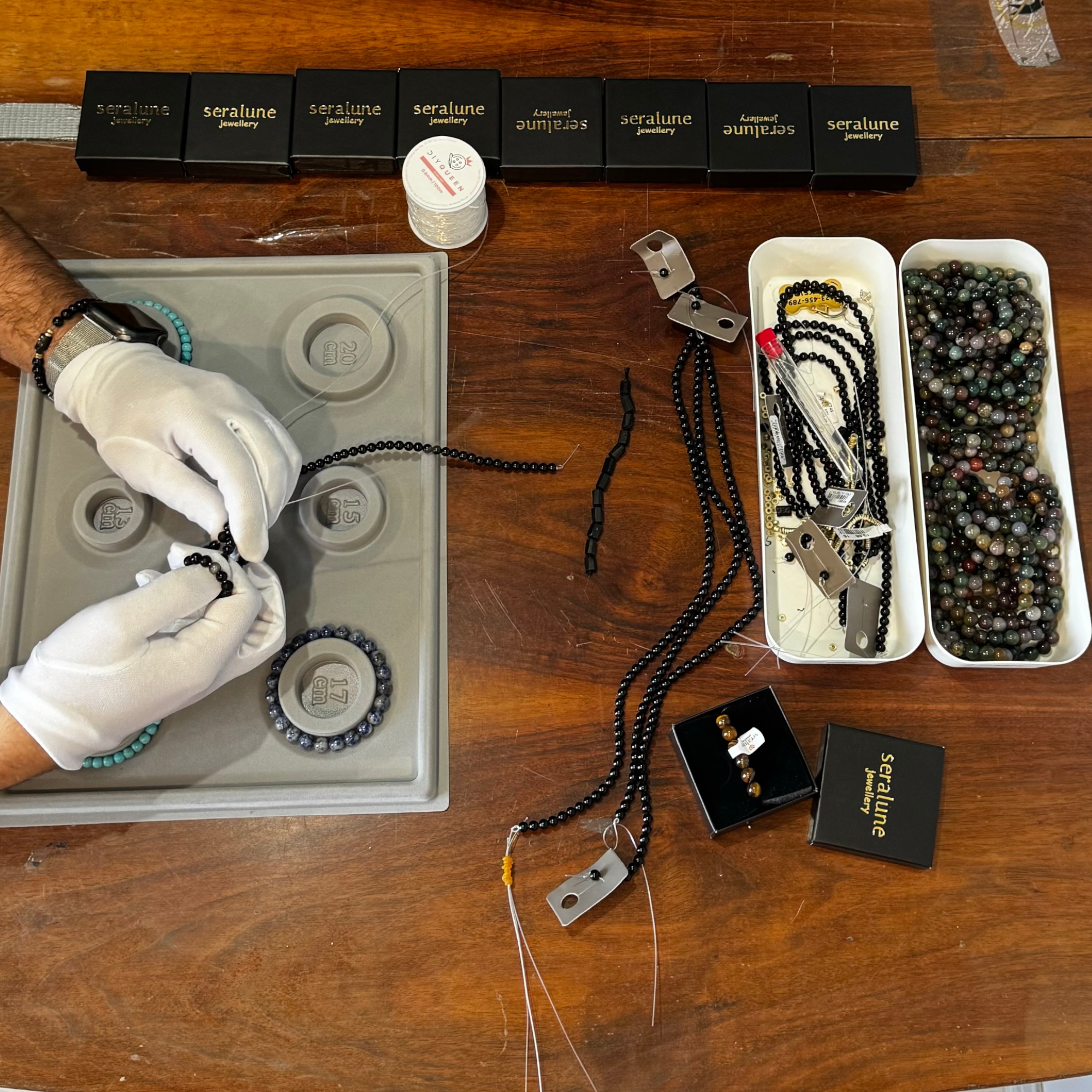 Zajrzyj za kulisy naszej pracy! Na zdjęciach możesz zobaczyć naszą pracownię, w której z pasją i dbałością o każdy detal powstają unikalne bransoletki. Każdy produkt tworzony jest ręcznie, z miłością do rzemiosła i estetyki.