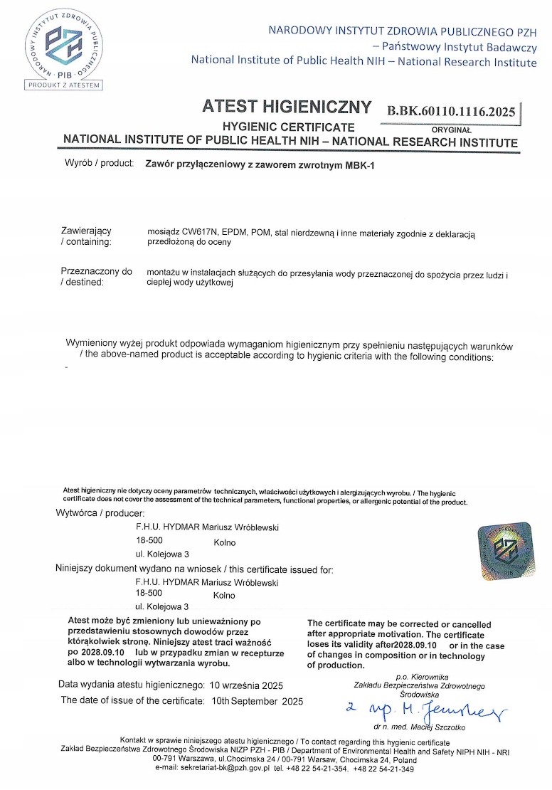 Prezentowany produkt posiada atest higieniczny PZH, wydany przez Narodowy Instytut Zdrowia Publicznego – Państwowy Zakład Higieny (NIZP-PZH). Dokument ten potwierdza, że wyrób: