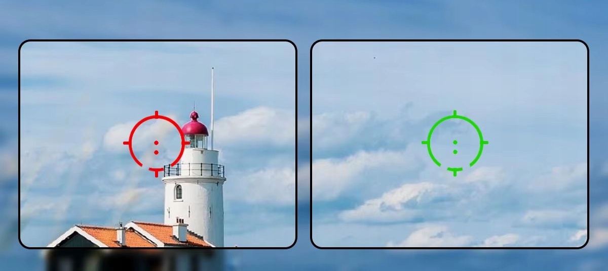 Czerwone i zielone kropki można elastycznie przełączać. W dobrze oświetlonym otoczeniu zielona plamka świetlna ma wyższy kontrast, a wrażliwość ludzkiego oka na zieleń ułatwia celowanie i szybkie uchwycenie celu. W słabo oświetlonym otoczeniu czerwona plama świetlna jest bardziej przyciągająca wzrok i nie jest łatwo mylona z tłem, co pomaga dokładnie uchwycić cel. Ta funkcja przełączania doskonale spełnia wymagania różnych środowisk i aplikacji.