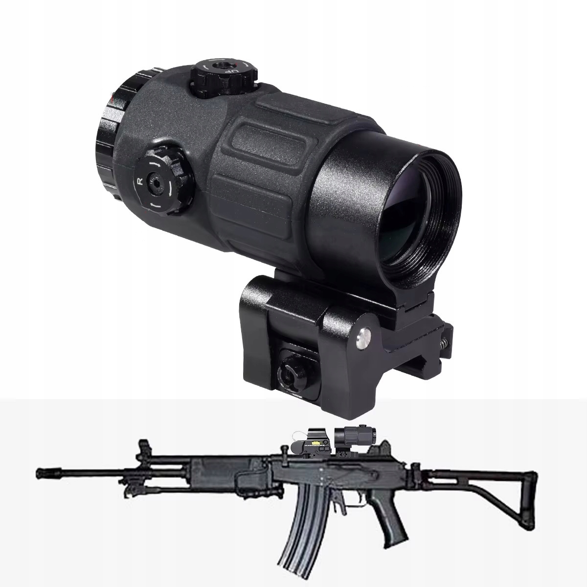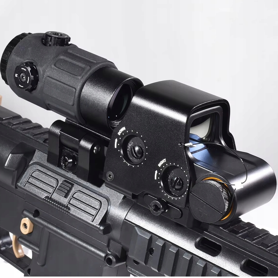 Czerwono-zielony kolimowany taktyczny celownik z czerwoną kropką 558 oraz luneta celownicza o powiększeniu G45 5X umożliwiają szybkie celowanie i precyzyjne strzelanie na dużych odległościach. W walce z bliska holograficzny kolimator 558 pozwala szybko zdobyć cel, natomiast w walce na średnim i dalekim dystansie może być używany w połączeniu z taktyczną lunetą powiększenia G45 5X, umożliwiającą uderzanie precyzyjnych ciosów.