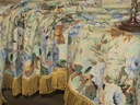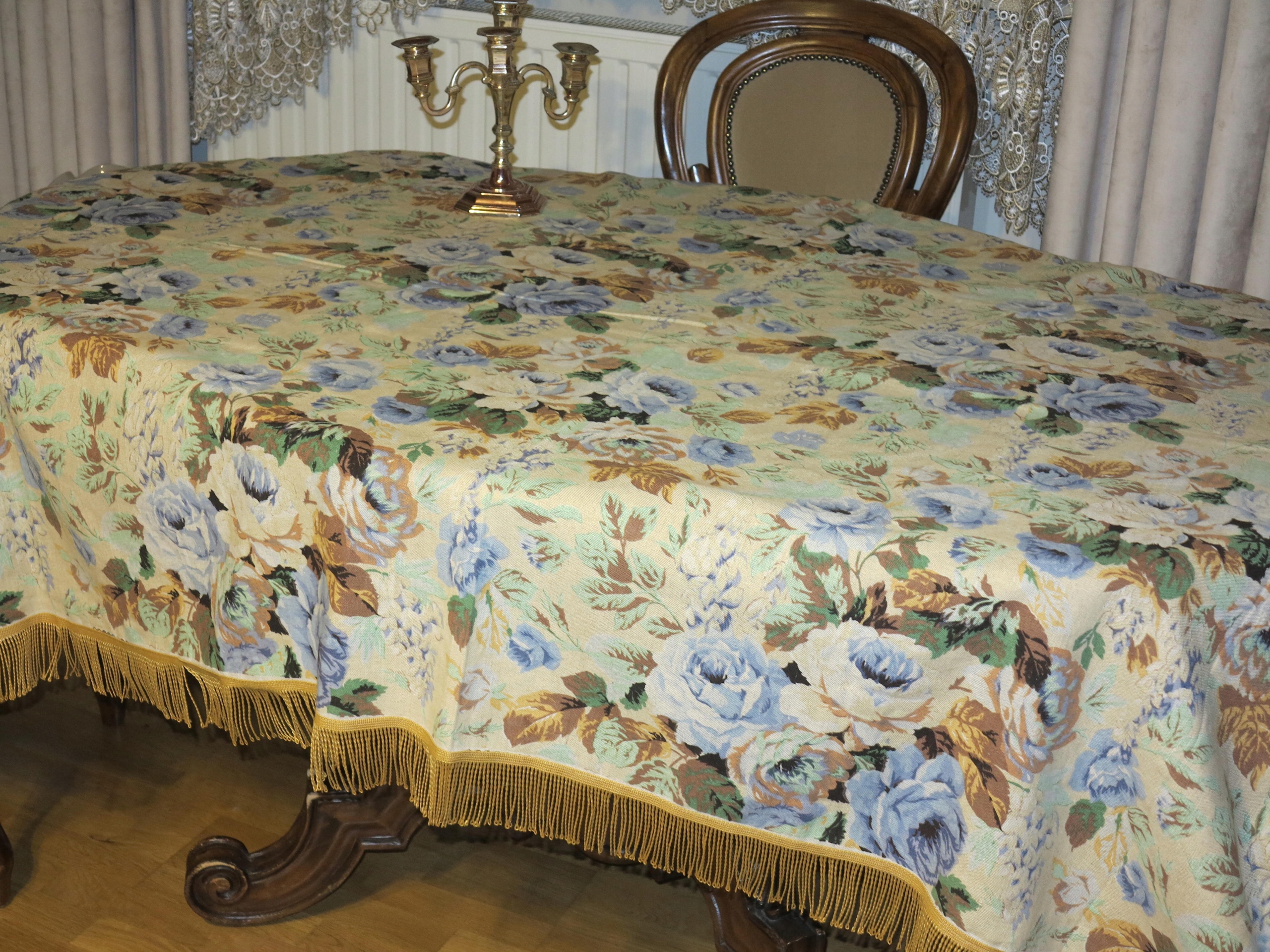 WYJĄTKOWO PIĘKNY, SOLIDNY OBRUS CZYSTO LNIANY W DUŻE BUKIETY RÓŻ W KOLORACH BŁĘKITU, NA OKOŁO ZDOBIONY FRĘDZLAMI. LEN GRUBSZY I BARDZO MOCNY