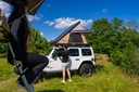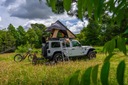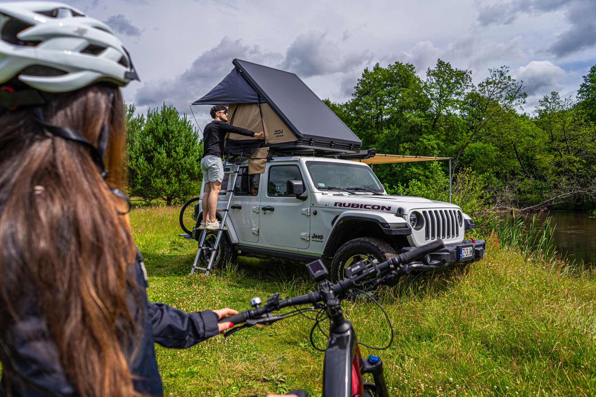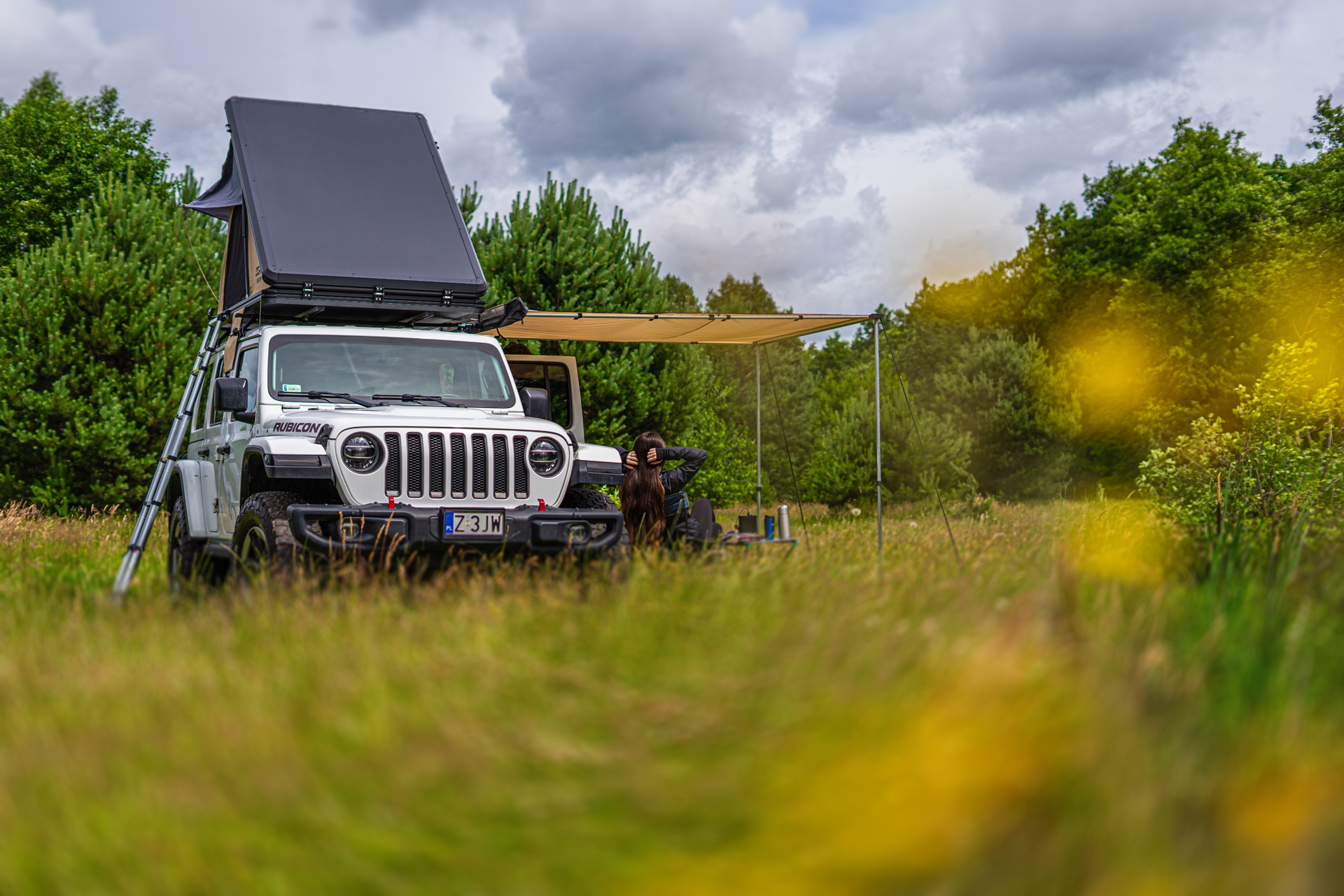Kontrast ciepłej tkaniny z chłodnym tropikiem i głęboką czernią aluminiowej skorupy nie tylko przyciąga wzrok, ale też podkreśla funkcjonalny, terenowy charakter namiotu. To kolorystyka inspirowana naturą i podróżą — ponadczasowa, praktyczna i pasująca do większości pojazdów.