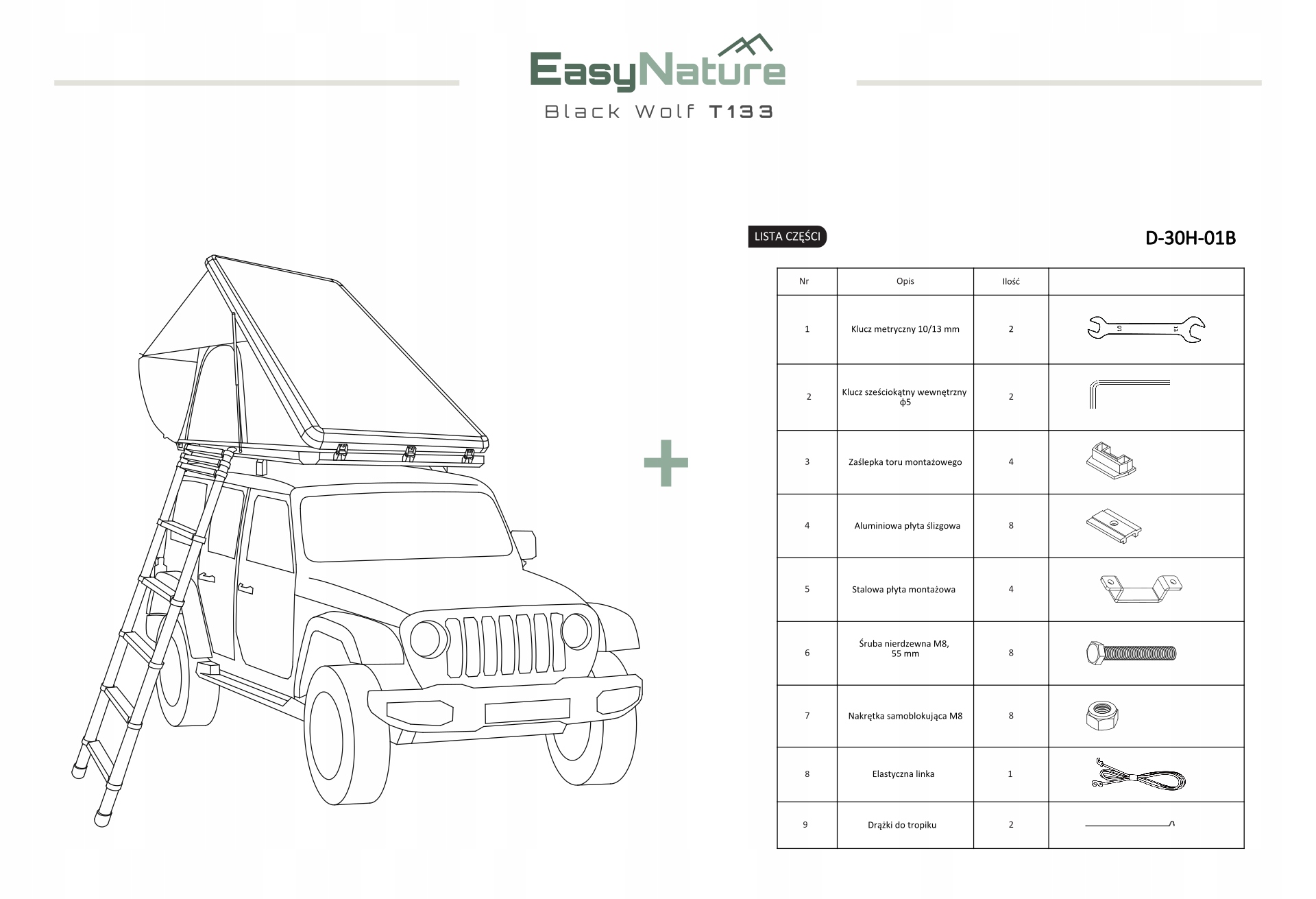 W zestawie znajdują się 4 stalowe uchwyty montażowe z gumowymi osłonkami, komplet śrub oraz nakrętek samokontrujących. Cały system zapewnia sztywne, pewne i bezpieczne mocowanie namiotu do pojazdu.