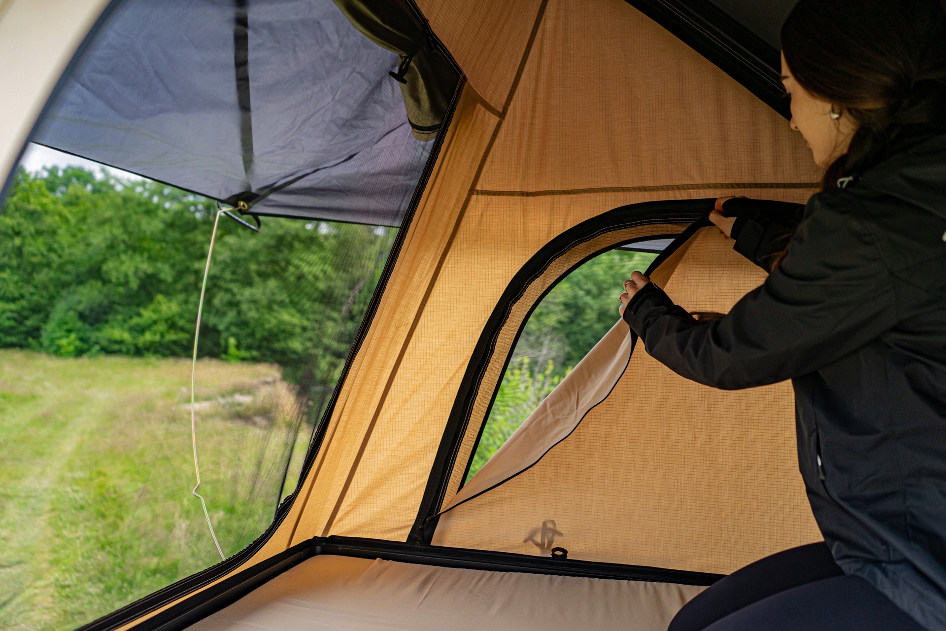 Trójkątna konstrukcja namiotu umożliwia panoramiczny widok 180° – wystarczy otworzyć wejścia i okna, by podziwiać wschód słońca, górskie szczyty lub taflę jeziora… bez wychodzenia z łóżka. To zaproszenie do celebrowania poranków i nocnego nieba w najlepszym możliwym wydaniu.