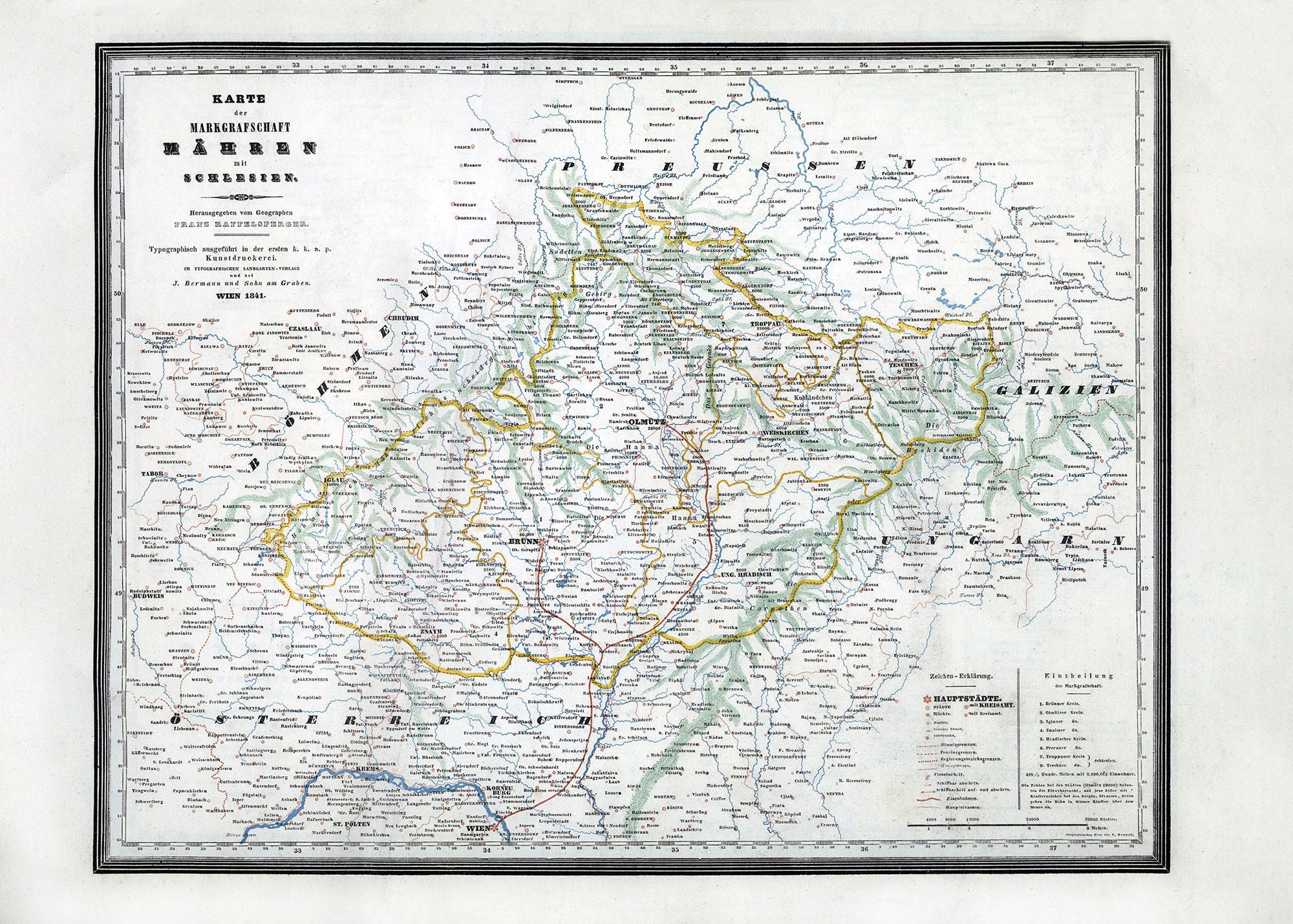 Ta szczegółowa mapa przedstawia terytoria Moraw i Śląska w połowie XIX wieku. Opracowana przez austriackiego geografa Franza Raffelspergera, została wydana w Wiedniu przez J. Bermanna & Sohn. Mapa stanowi część „Erster typometrischer Atlas” i odzwierciedla ówczesne granice oraz strukturę administracyjną regionu.archive.org
