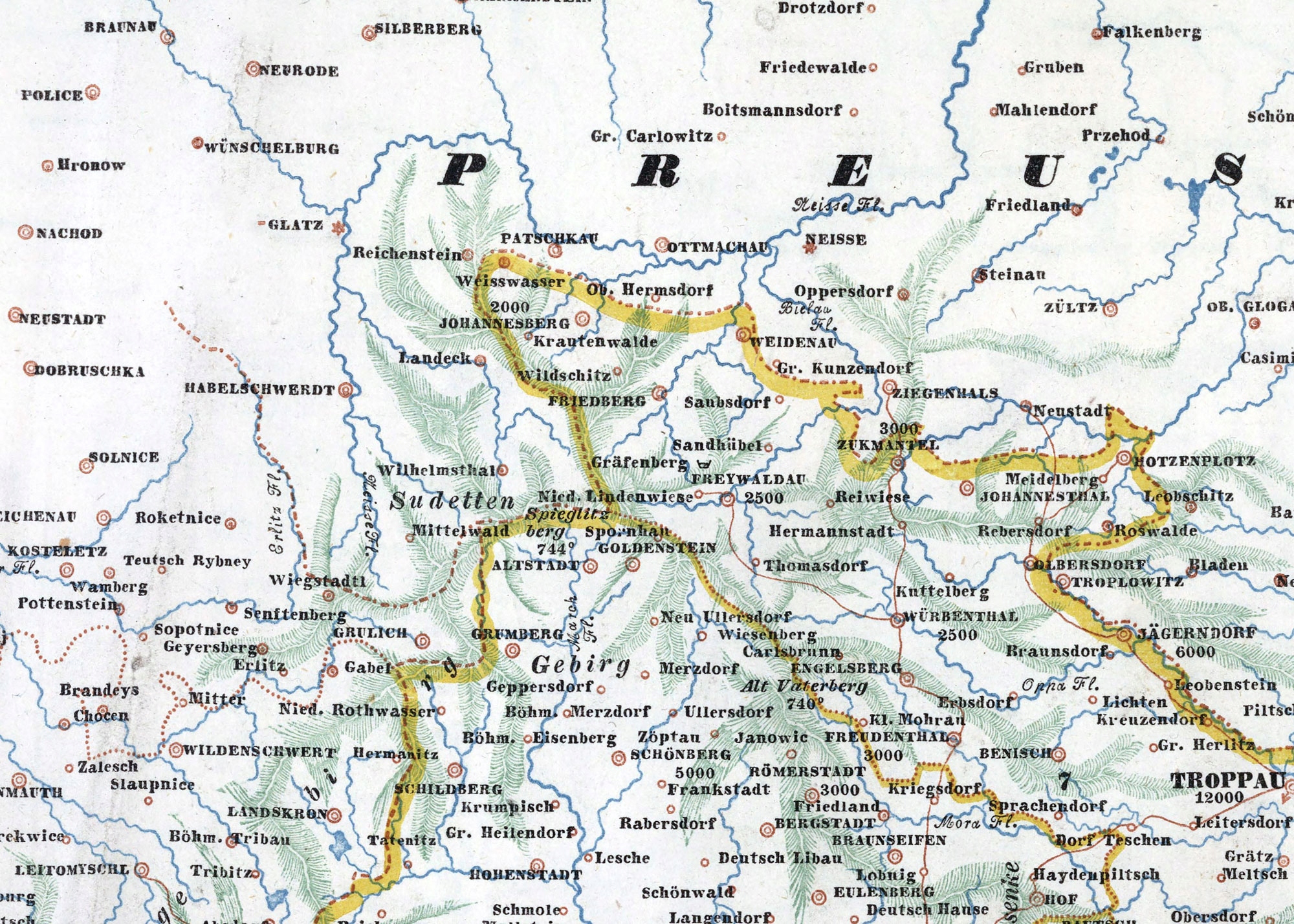 Reprodukcja mapy Moraw i Śląska – „Karte der Markgrafschaft Mähren mit Schlesien” autorstwa Franza Raffelspergera. Oryginalnie wydana w 1843 roku.