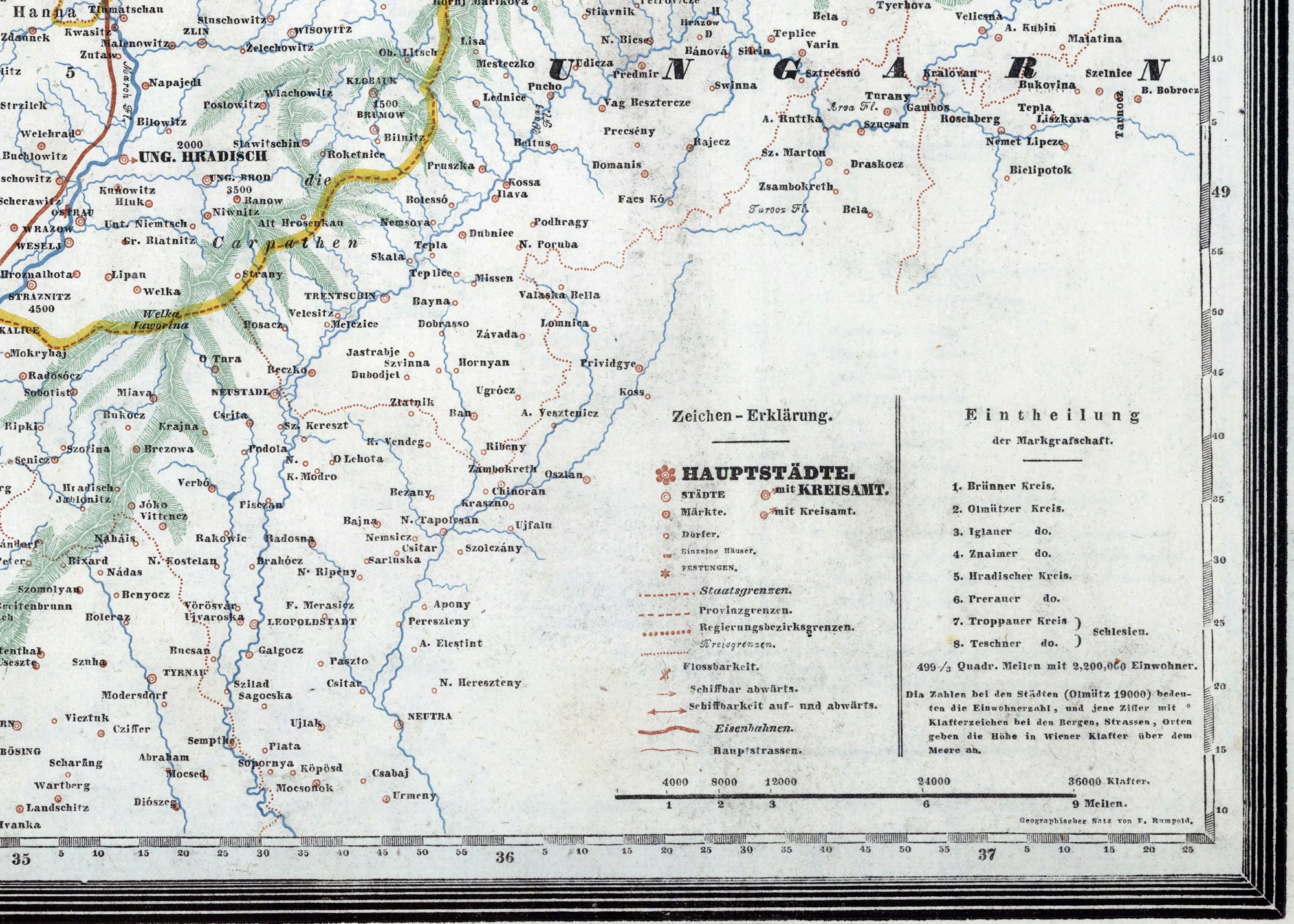 Reprodukcja mapy Moraw i Śląska – „Karte der Markgrafschaft Mähren mit Schlesien” autorstwa Franza Raffelspergera. Oryginalnie wydana w 1843 roku.