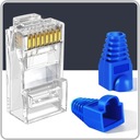 Wtyki przelotowe na kabel nieekranowany kat.5e. Wtyki do stosowania z dedykowanymi jak i standardowymi zaciskarkami RJ45 należy obciąć wystające żyły po zaciśnięciu.