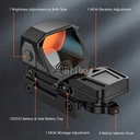 ----- Czerwone podświetlane i wielokrotne siatki: czerwona kropka reflex sight z 4 kształtami celownika i 7 ustawieniami jasności, zapewnia różne możliwości w różnych okazjach, takich jak słoneczny, pochmurny dzień. Przycisk z guzikami wzorem ułatwia regulacja jasności.