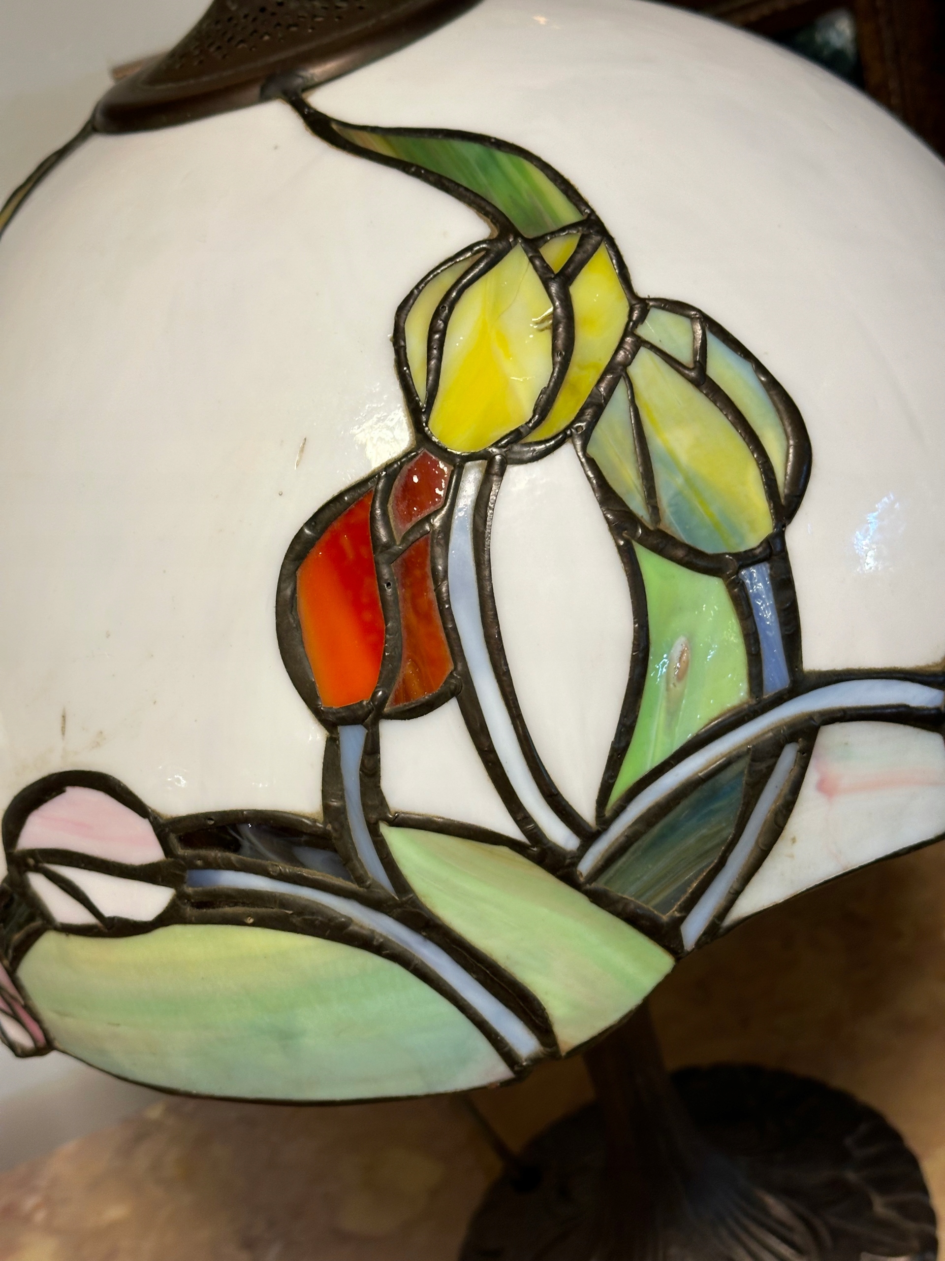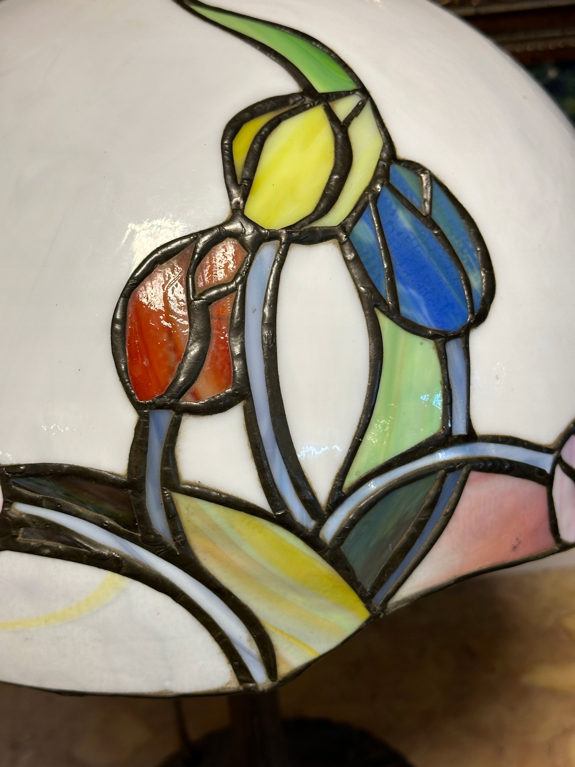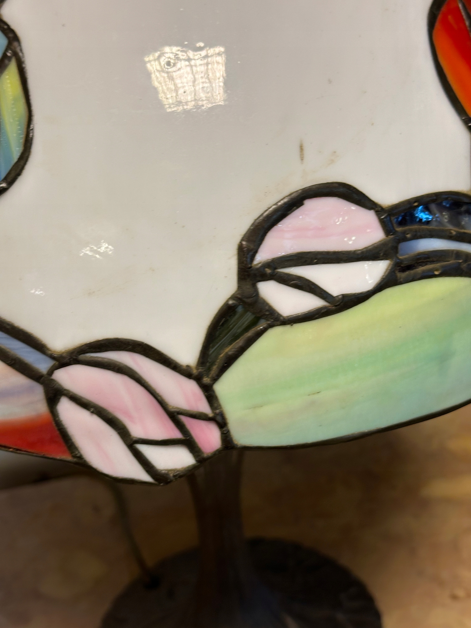 KLOSZ Z PRZEWAGĄ KOLORÓW CZERWONO ŻÓŁTO RÓŻOWYCH I ZIELONYCH ALE GÓRNA CZĘŚĆ KLOSZA W KOLORZE BIAŁYM