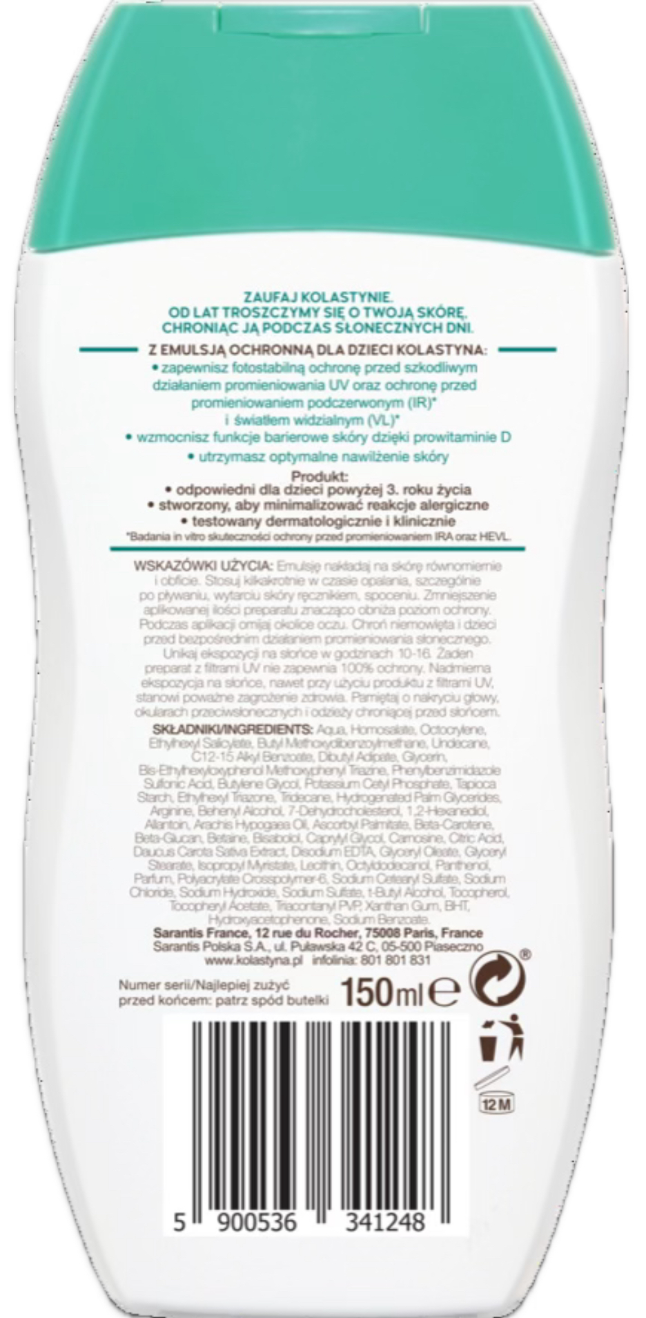 Emulsja do opalania dla dzieci SPF 50 **KOLASTYNA** to idealne rozwiązanie dla delikatnej skóry Twojego dziecka. Zapewnia **wysoką ochronę** przed czterema głównymi rodzajami promieniowania: **UVA, UVB, światło widzialne oraz promieniowanie podczerwone**. Dzięki temu, Twoje dziecko jest chronione przed poparzeniami słonecznymi oraz przedwczesnym starzeniem się skóry.