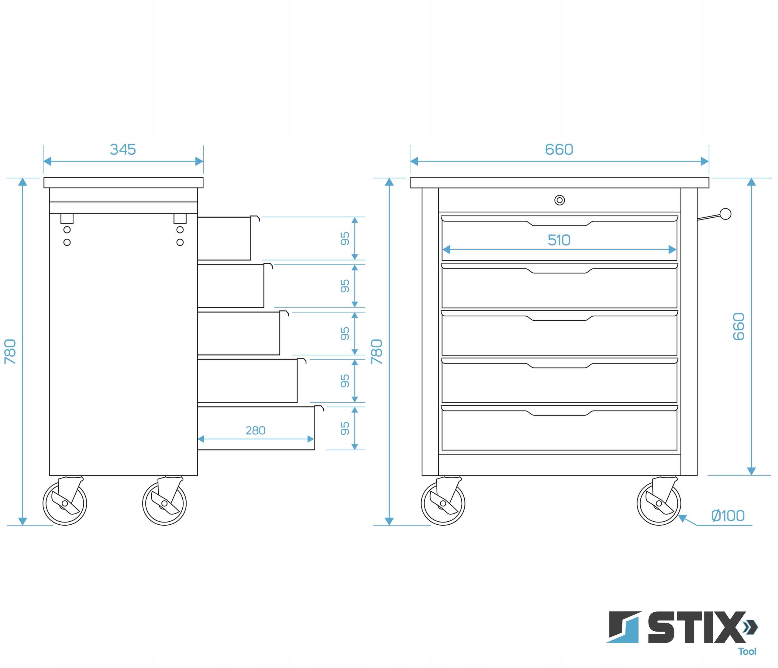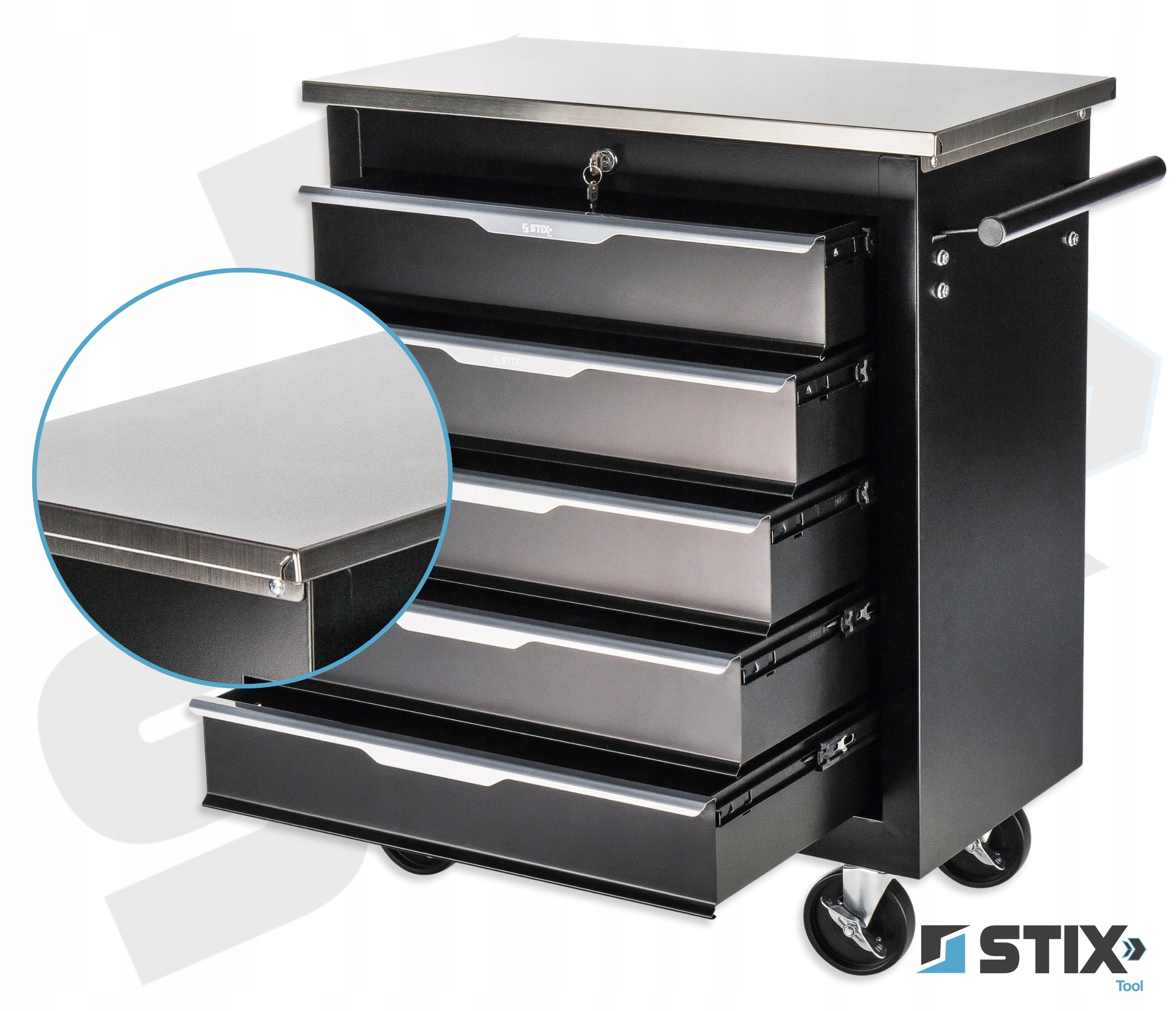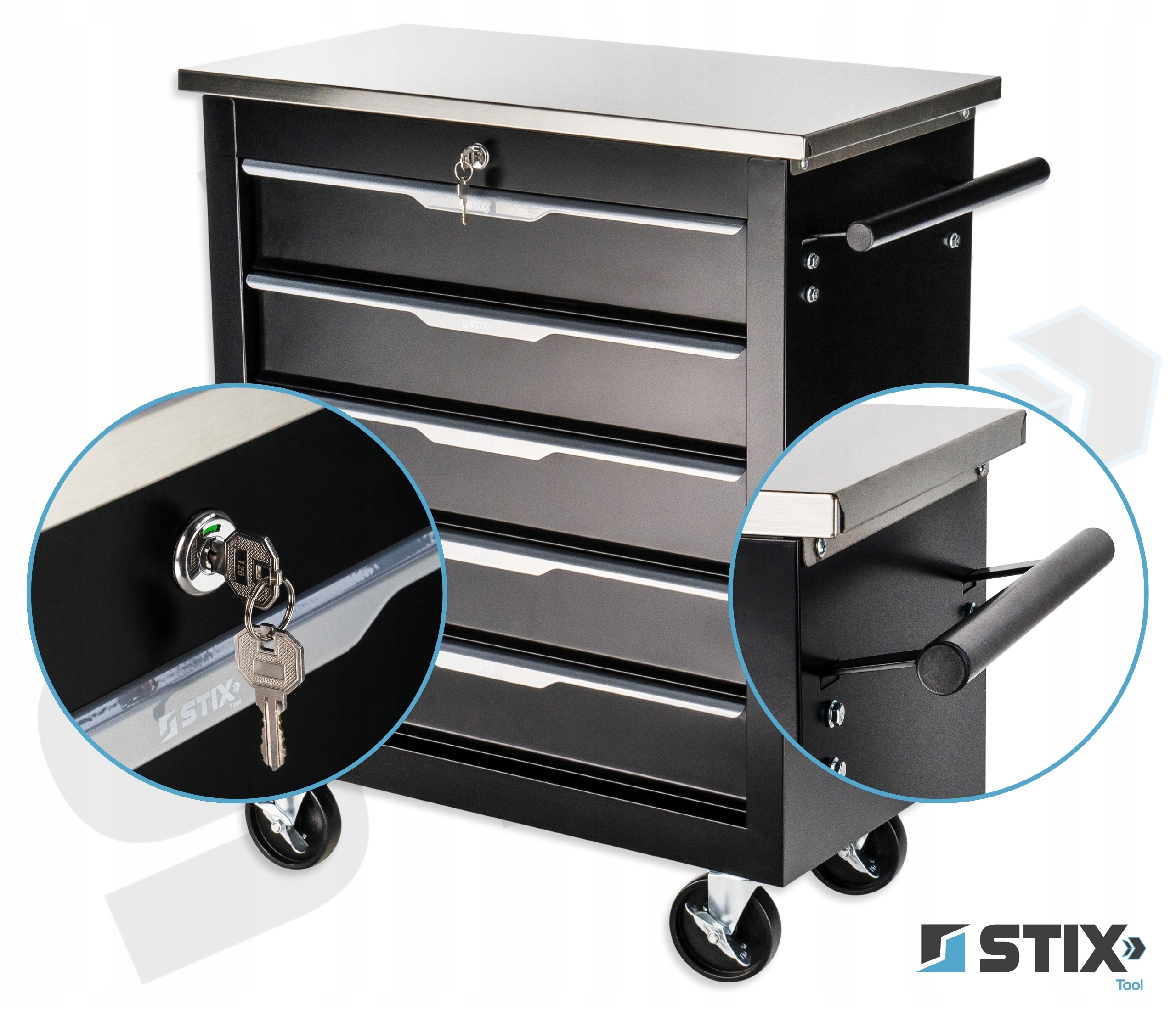 Dzięki temu wózek z łatwością przemieszcza się po warsztacie, a po zatrzymaniu – pozostaje stabilny i bezpieczny.