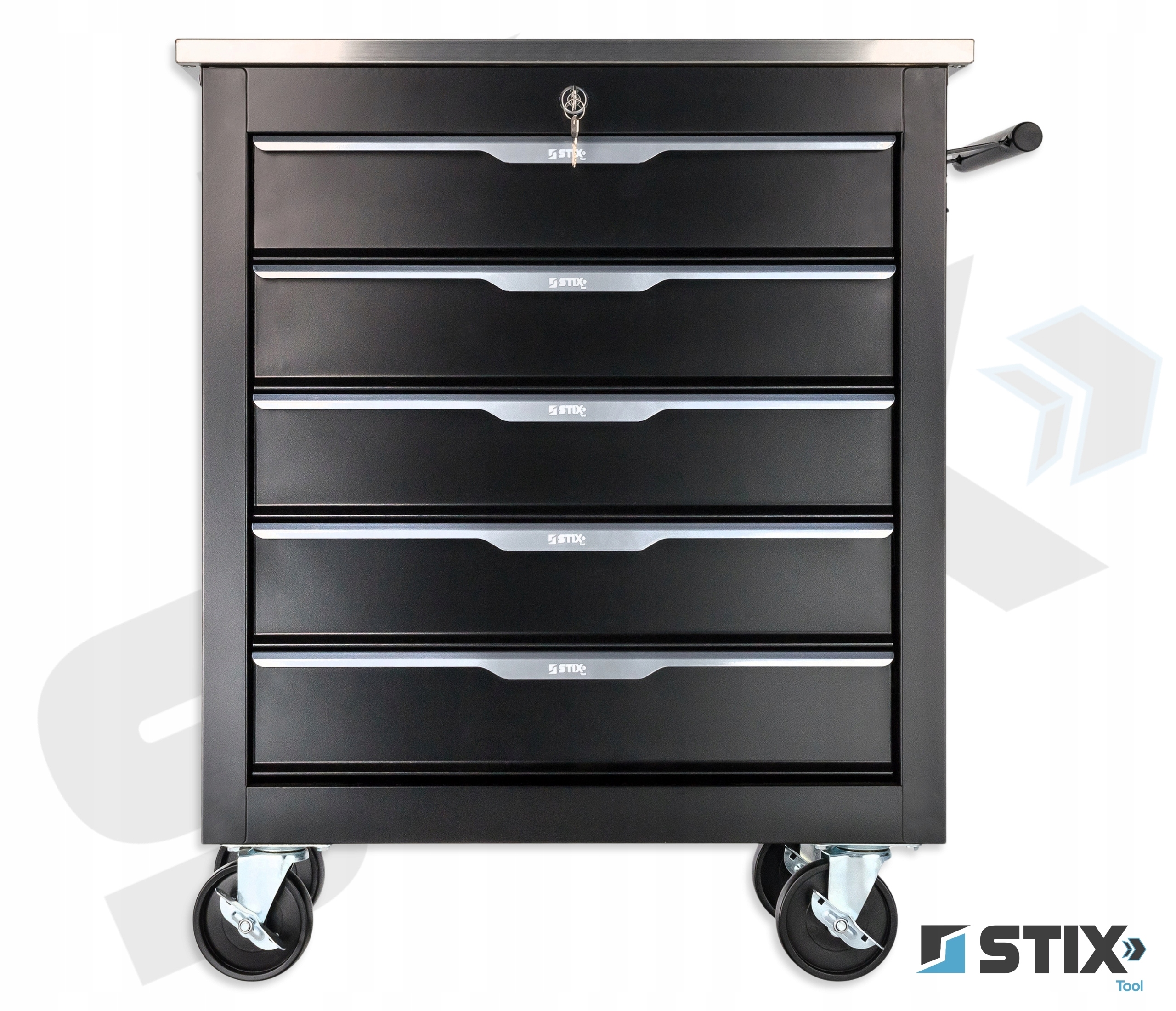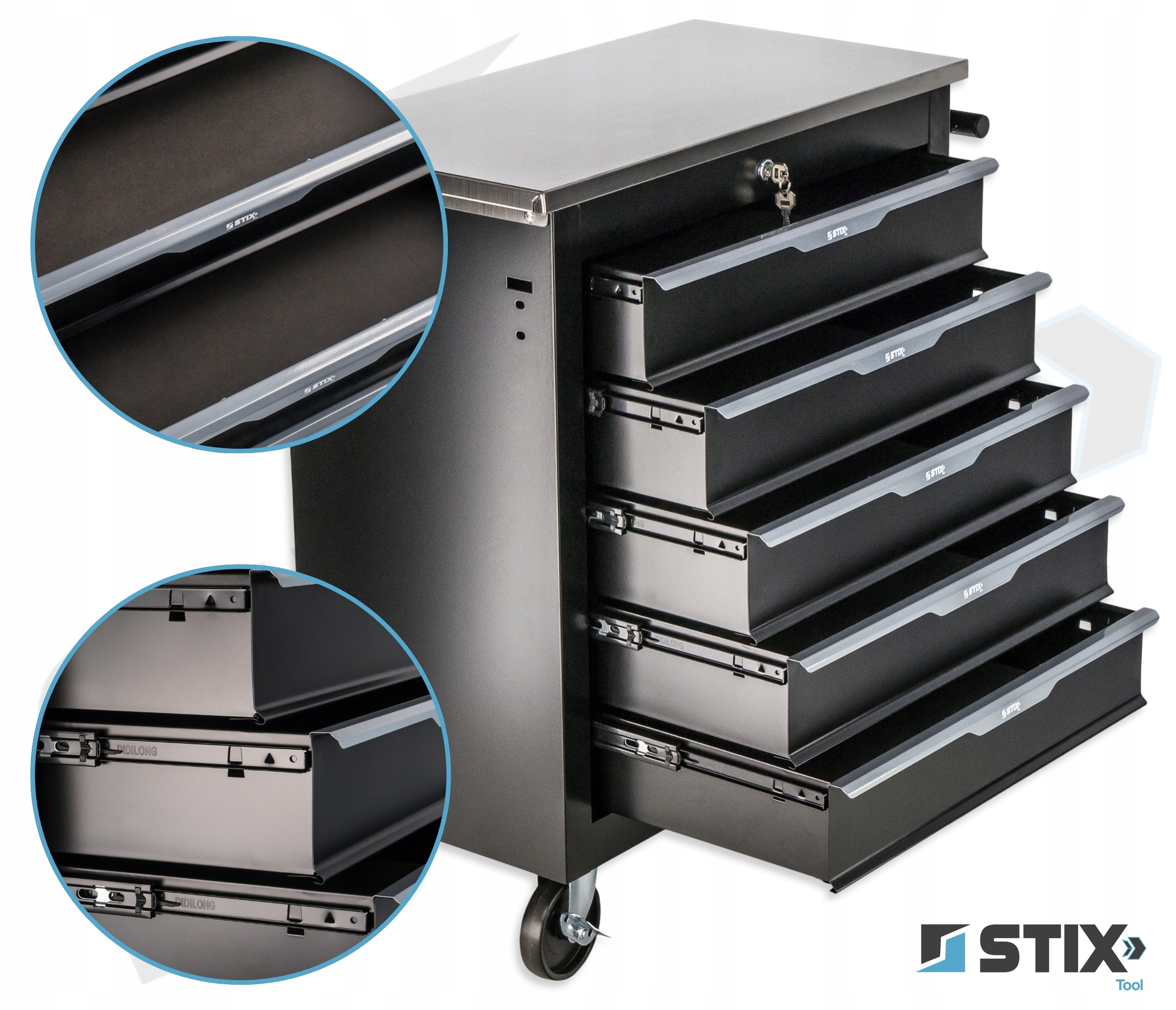 Centralny zamek blokuje wszystkie szuflady jednocześnie, chroniąc narzędzia przed niepowołanym dostępem.