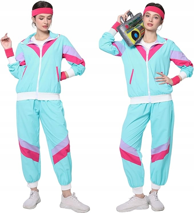 Strój męski i damski w stylu lat 80. XX wieku, kostium do joggingu, kurtka i spodnie retro z akcesoriami, radio, okulary przeciwsłoneczne, opaska przeciwpotowa na karnawał, imprezę
