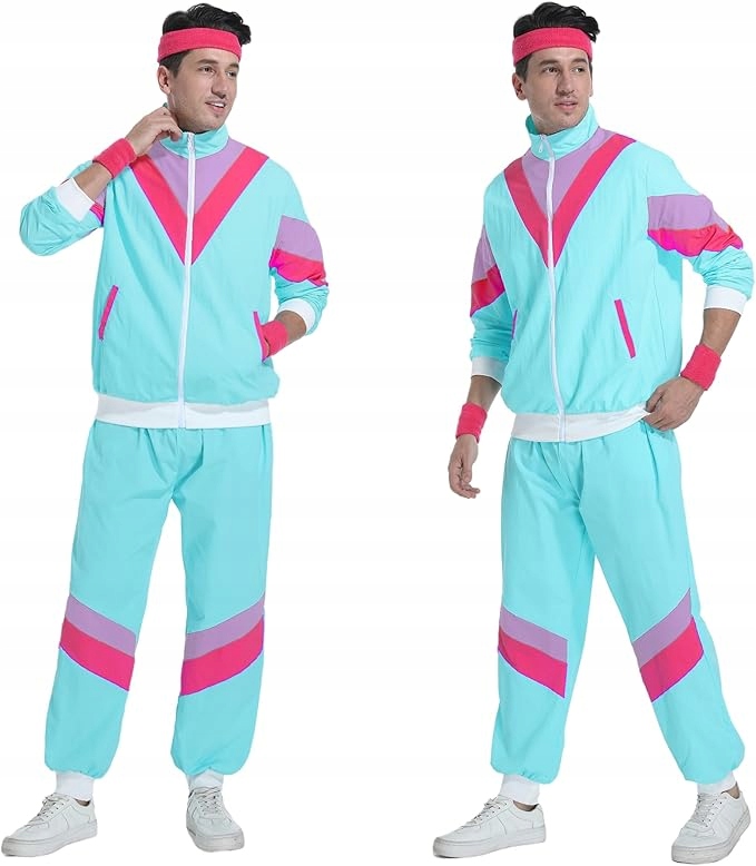 Strój męski z lat 80. Nadaje się do noszenia na co dzień, joggingu, siłowni, imprez hip-hopowych, imprez retro, imprez kostiumowych disco, imprez w stylu lat 80. i 90., streetwearu, uroczystości, Halloween, Boże Narodzenie i wiele innych. Kostium dyskotekowy z lat 80. dla mężczyzn i kobiet to atrakcyjny i modny wybór, który sprawi, że będziesz się wyróżniać.