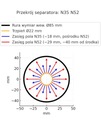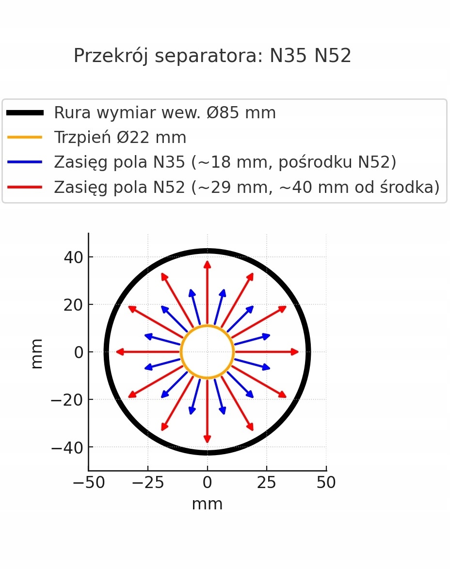 Czerwona strzałka pokazuje zasięg pola magnetycznego w naszym separatorze, jak widać średnica jest dobrana tak, aby pole magnetyczne pokrywało niemal całą średnicę rury Ø85 mm (wew.).