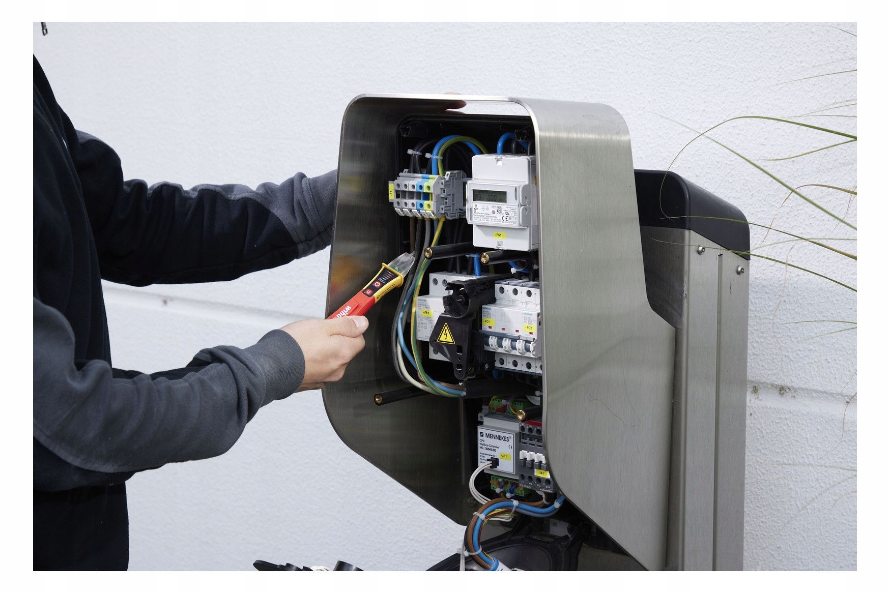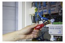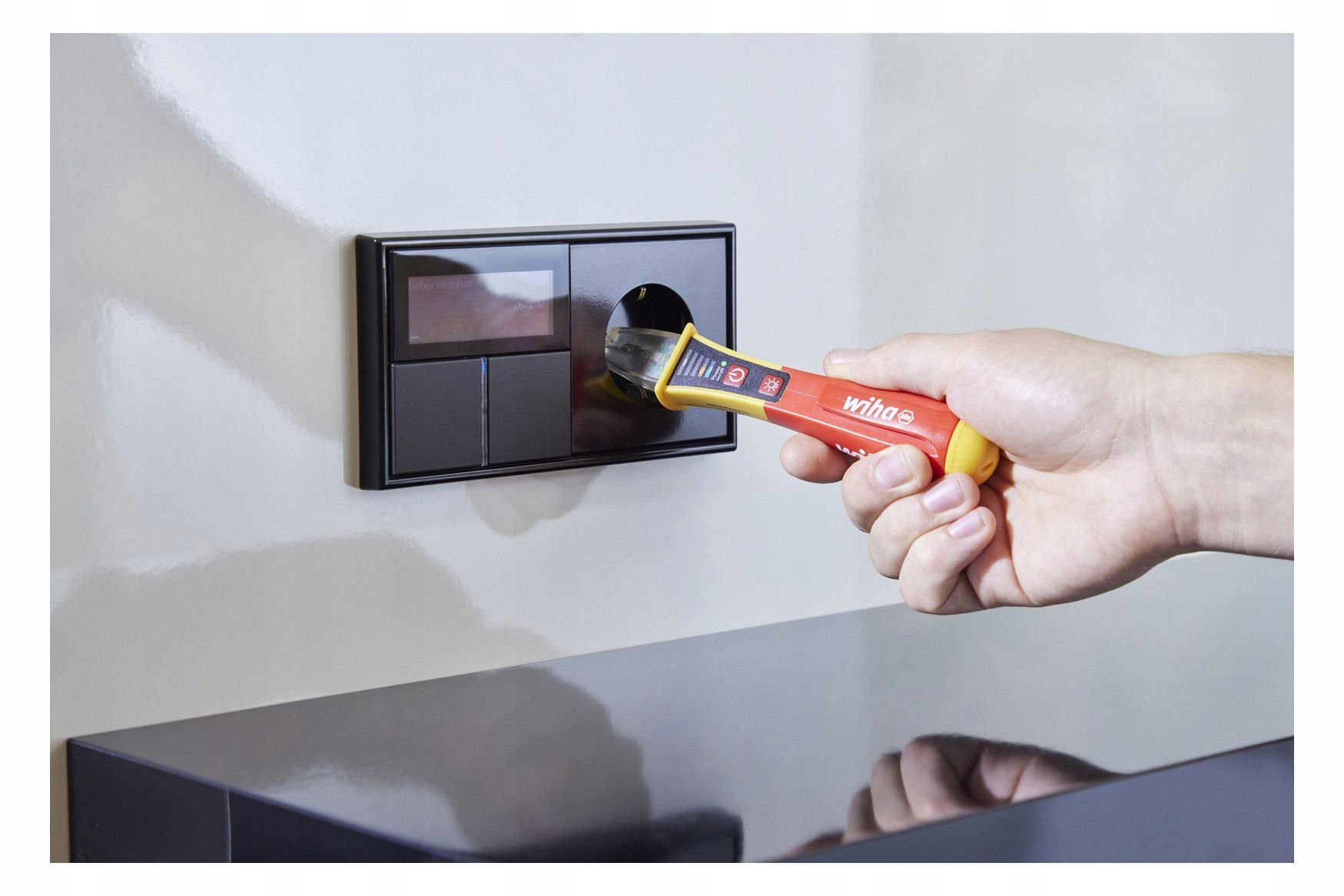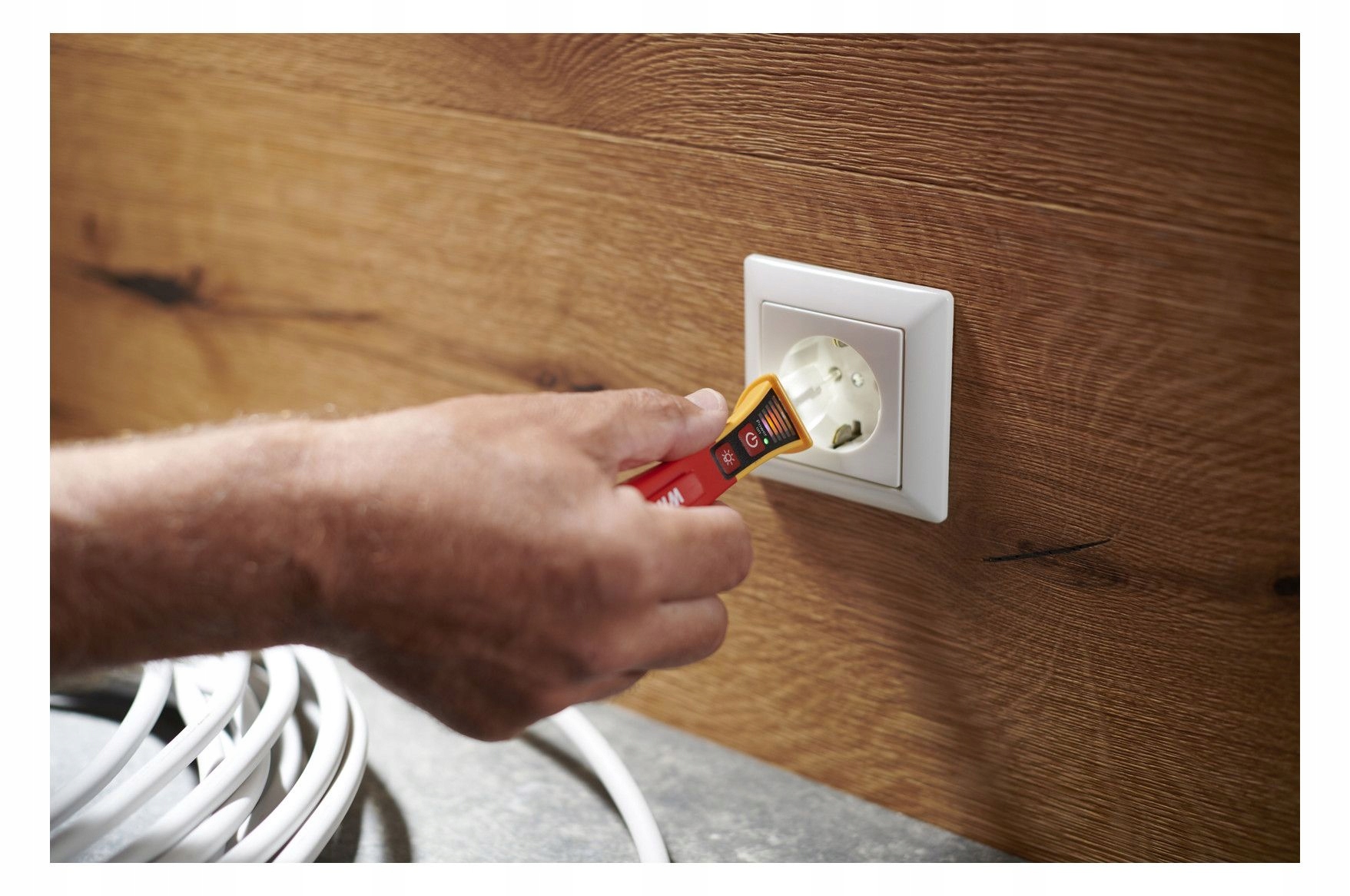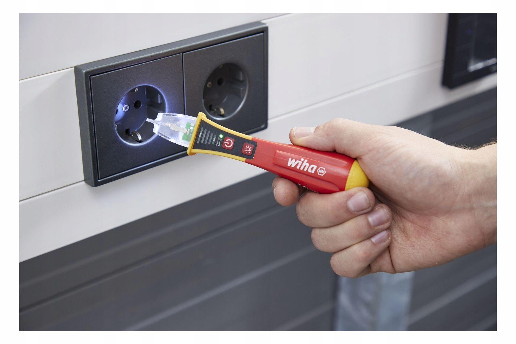 Oszczędność czasu Szybkie sprawdzanie napięcia dzięki pomiarowi bezdotykowemu. Zwiększa wydajność Dzięki dostosowanej na całym świecie końcówce pomiarowej można ją stosować do wszystkich gniazdek na całym świecie. Zwiększa Twoją wydajność. Zintegrowana, jasna latarka LED. Zwiększa elastyczność Tester napięcia obejmuje szeroki zakres napięć od 12 do 1000 V AC. Zastosowanie Do wykrywania i lokalizacji przewodów pod napięciem, przerw i przerw w kablach, przepalonych bezpieczników, uszkodzonych lamp w łańcuchach świetlnych i wykrywania pojedynczych żył. Normy CAT IV 1000 VAC Przed rozpoczęciem instalacji elektrycznej elektrycy muszą upewnić się, że w środowisku pracy nie występuje napięcie. Aby przetestować zmienne pola elektryczne lub zlokalizować podejrzane źródła błędów, wymagany jest tester napięcia. Bezdotykowy tester napięcia Wiha umożliwia wstępne wskazanie braku napięcia za pomocą sygnałów optycznych i akustycznych. Po włączeniu świeci się stale zielona dioda LED, co oznacza, że urządzenie działa. Podczas testowania napięcia, w zależności od siły zmiennego pola elektrycznego, diody LED świecą od słabego niebieskiego, przez pomarańczowy, do mocnej czerwieni. Do użycia potrzebne są dwie baterie AAA, które wchodzą w zakres dostawy. Jeśli urządzenie nie będzie używane przez 4 minuty, wyłączy się automatycznie, aby oszczędzać energię. Zintegrowana latarka LED umożliwia pomiar oświetlenia punktowego w ciemnym otoczeniu i może być używana jako latarka poprzez ręczne włączanie i wyłączanie. Dzięki poręcznym rozmiarom tester napięcia z klipsem zmieści się wygodnie w każdej kieszeni koszuli lub spodni. Dzięki międzynarodowej końcówce pomiarowej tester napięcia nadaje się do wszystkich wariantów gniazd na całym świecie. Jednobiegunowy tester napięcia podlega normie EN 61010-1 IEC 61326 i jest zaprojektowany dla CAT IV 1000VAC. Do zastosowań elektrycznych Przed i po każdym użyciu tester napięcia należy przetestować na znanym źródle napięcia, aby zapewnić jego funkcjonalność.